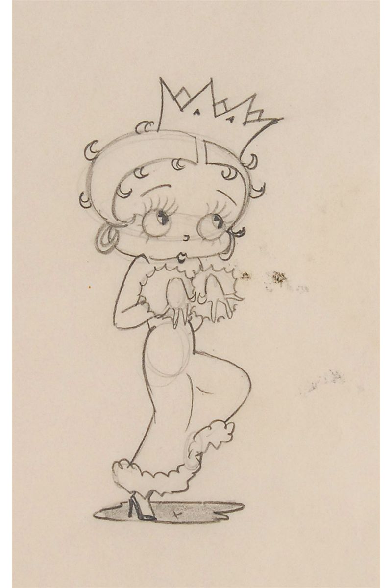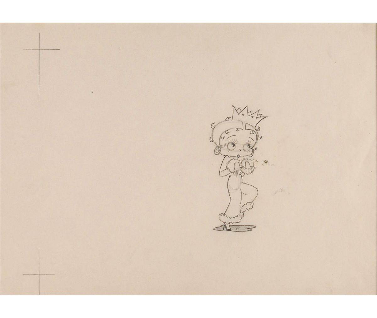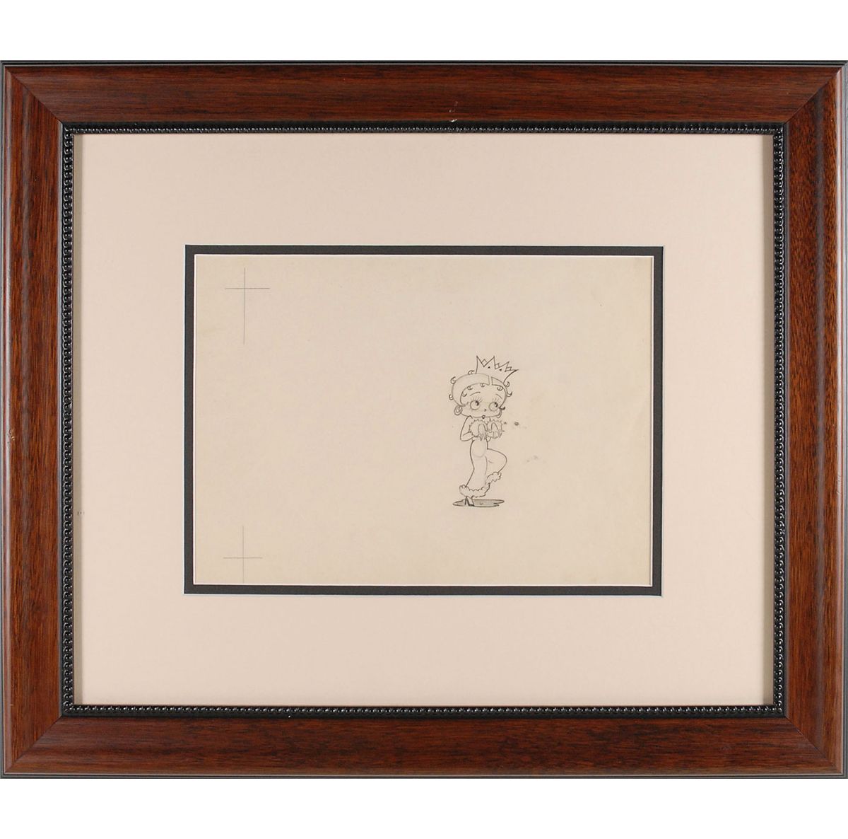 (Fleischer Studios, 1933) Original production drawing featuring Betty Boop from Betty Boop’s May Party, showing her wearing a crown and taking a step forward. Accomplished in graphite on animation paper. Image measures 1.5 x 3.5, with a mat opening of 10.25 x 7.5. This piece is also framed to an overall size of 19.5 x 16.5. In fine condition.