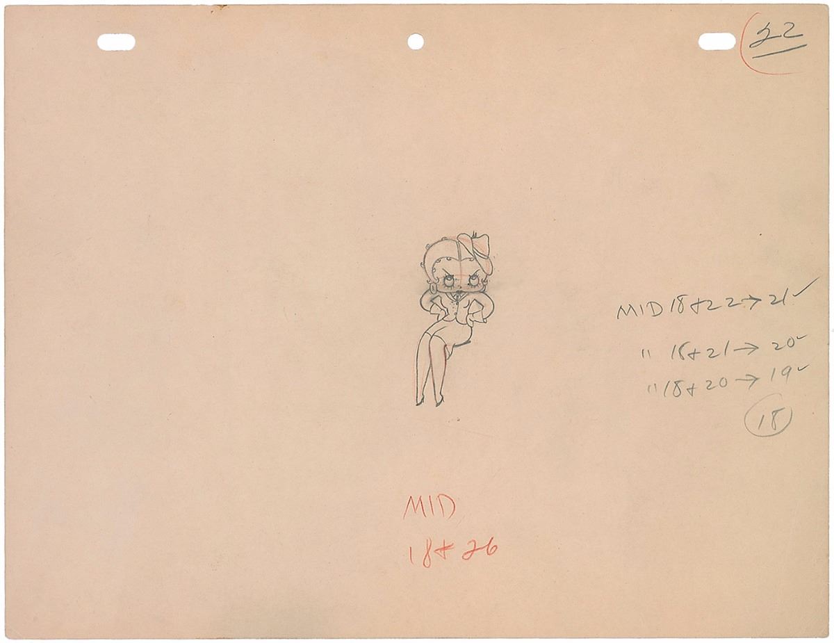 (Fleischer Studios, 1935) Rare original production drawing featuring Betty Boop from Judge for a Day, picturing her sitting in a dress suit with an irritated expression. Accomplished in graphite on untrimmed 11 x 8.5 animation paper. Image measures 1 x 2.25. In fine condition, with a spot of soiling to top edge.