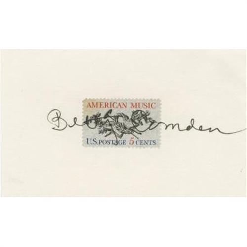 <B>Betty Comden Autograph.</B></I> A 3" x 5" card, with a five-cent commemorative postage stamp affixed, signed by the celebrated songwriter/actress/writer in black ink. Comden's autograph extends across the face of the stamp and is large and clean. In Excellent condition.<BR><BR><b>Shipping:</b> Flat Material, Small (<a target="_blank" href="http://www.heritageauctions.com/common/shipping.php">view shipping information</a>)