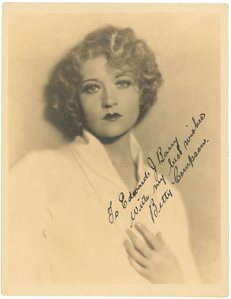 Eye-catching vintage matte-finish 7.75 x 10 photo, signed and inscribed in fountain pen “To Edward J. Barry, with my best wishes, Betty Compson.” In fine condition, with a few light corner tip creases and some scattered light silvering.