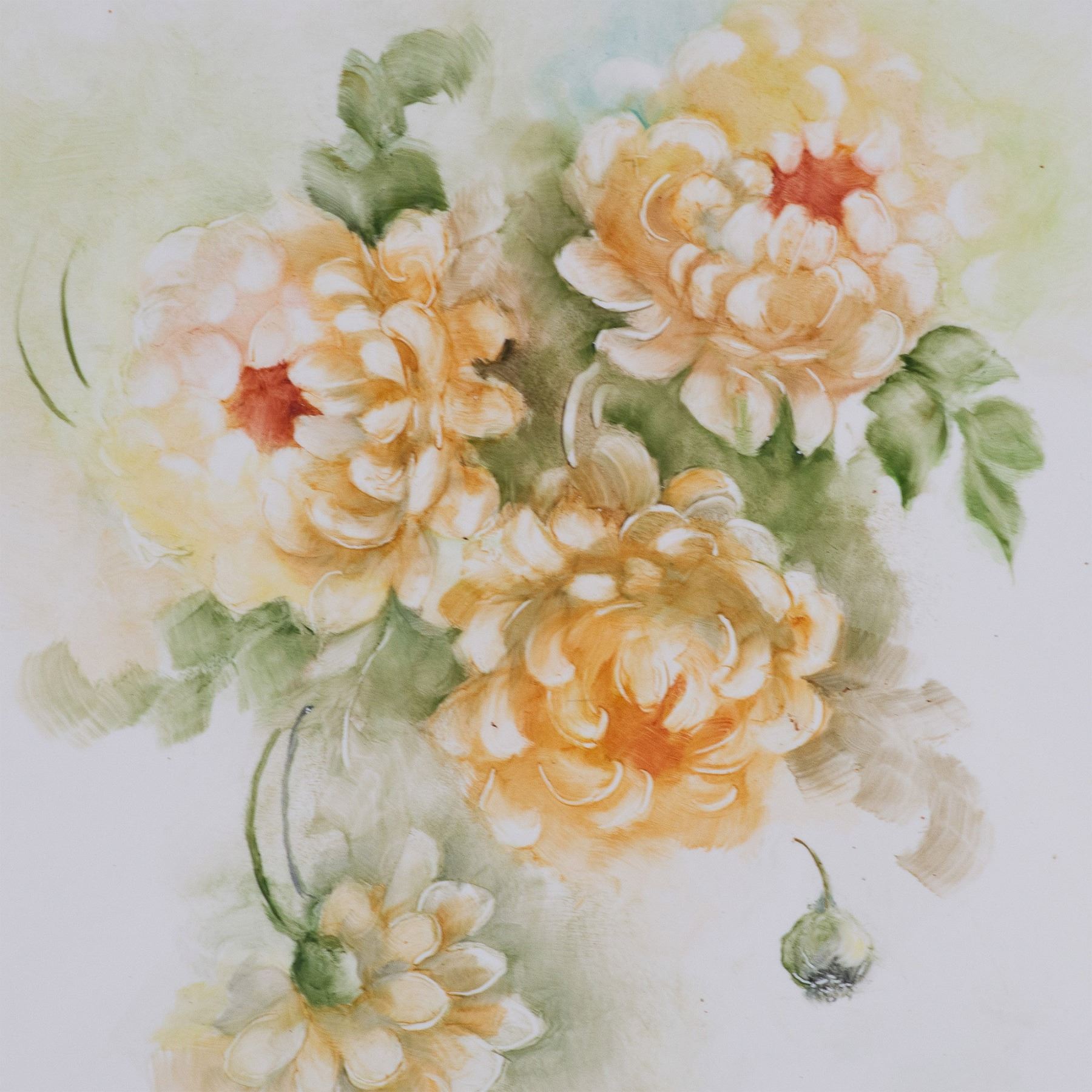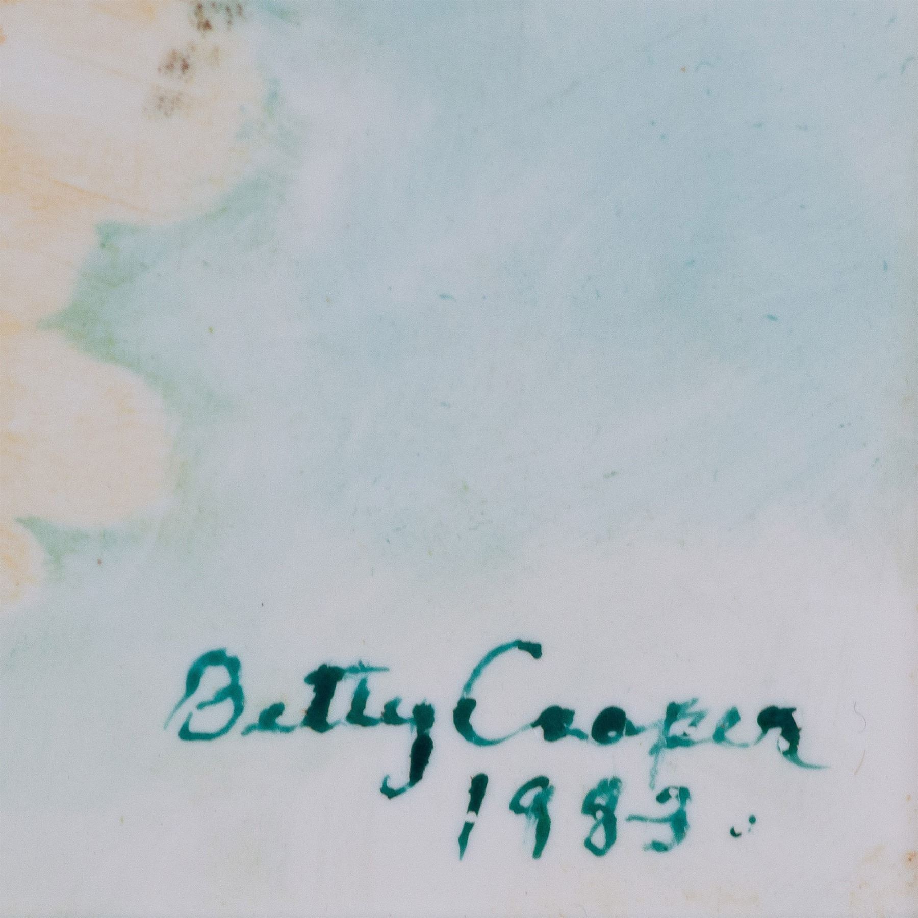 This original floral painting by Betty Cooper, dated 1983, showcases a delicate arrangement of yellow and peach chrysanthemums set against a soft, watercolor-inspired background. The piece is signed and dated by the artist in the lower right corner. The painting is framed in an ornate gold-tone frame, accentuating its timeless elegance. Betty Cooper's work is celebrated for its vibrant use of color and graceful floral compositions, making this piece an ideal addition to a collector's or decorator's collection.