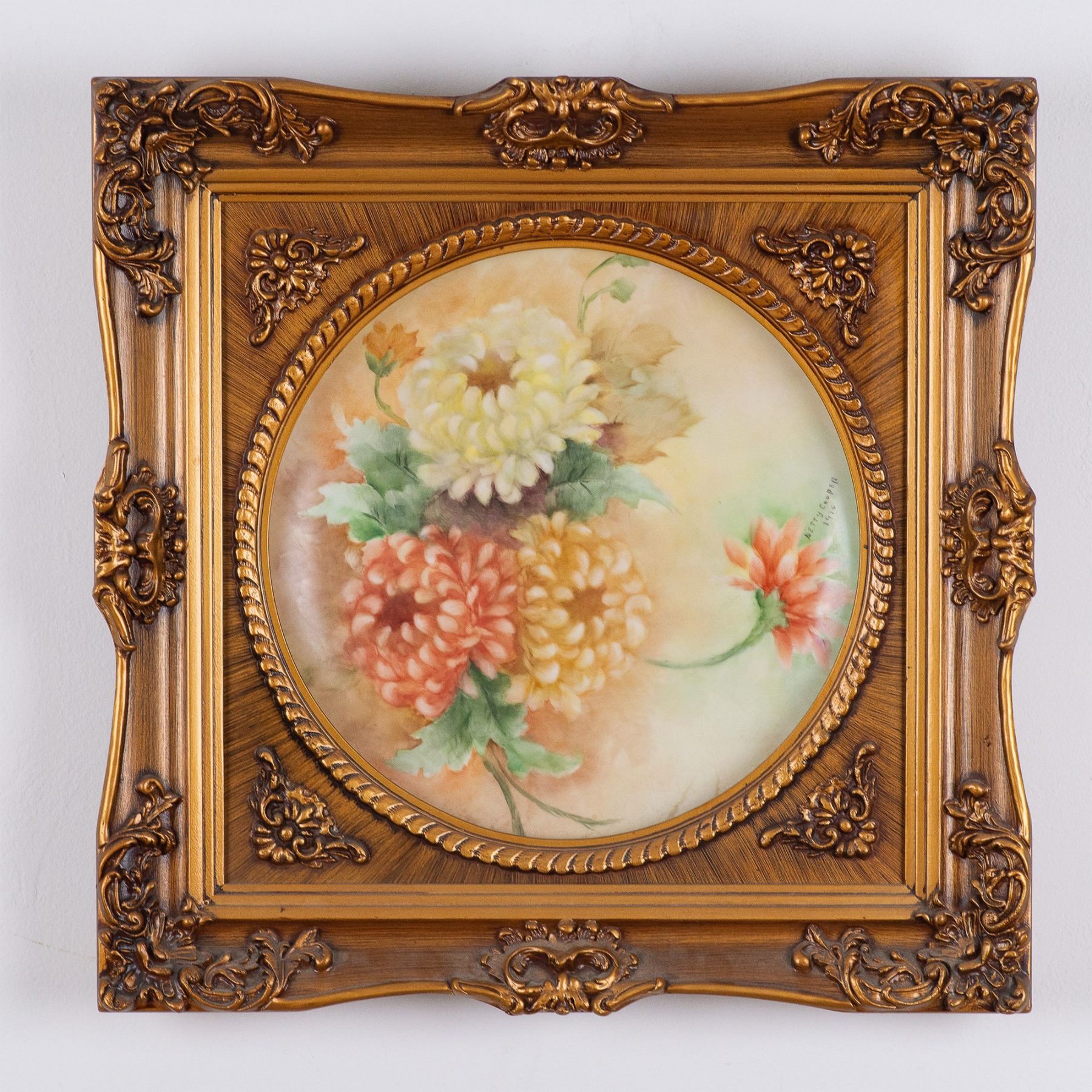 A stunning hand-painted porcelain plaque by artist Betty Cooper, dated 1976. This piece showcases a beautiful arrangement of chrysanthemums in soft, warm tones, rendered with delicate detail and a classic painterly style. The plaque is signed by the artist in the lower right corner and set within an intricately designed gilt frame with Rococo-style embellishments, adding an elegant touch to the artwork. Betty Cooper's works are highly regarded for their refined technique and timeless appeal, making this a wonderful addition to any fine art or porcelain collection. Plate: 12"dia. Frame: 18"L x 18"H.