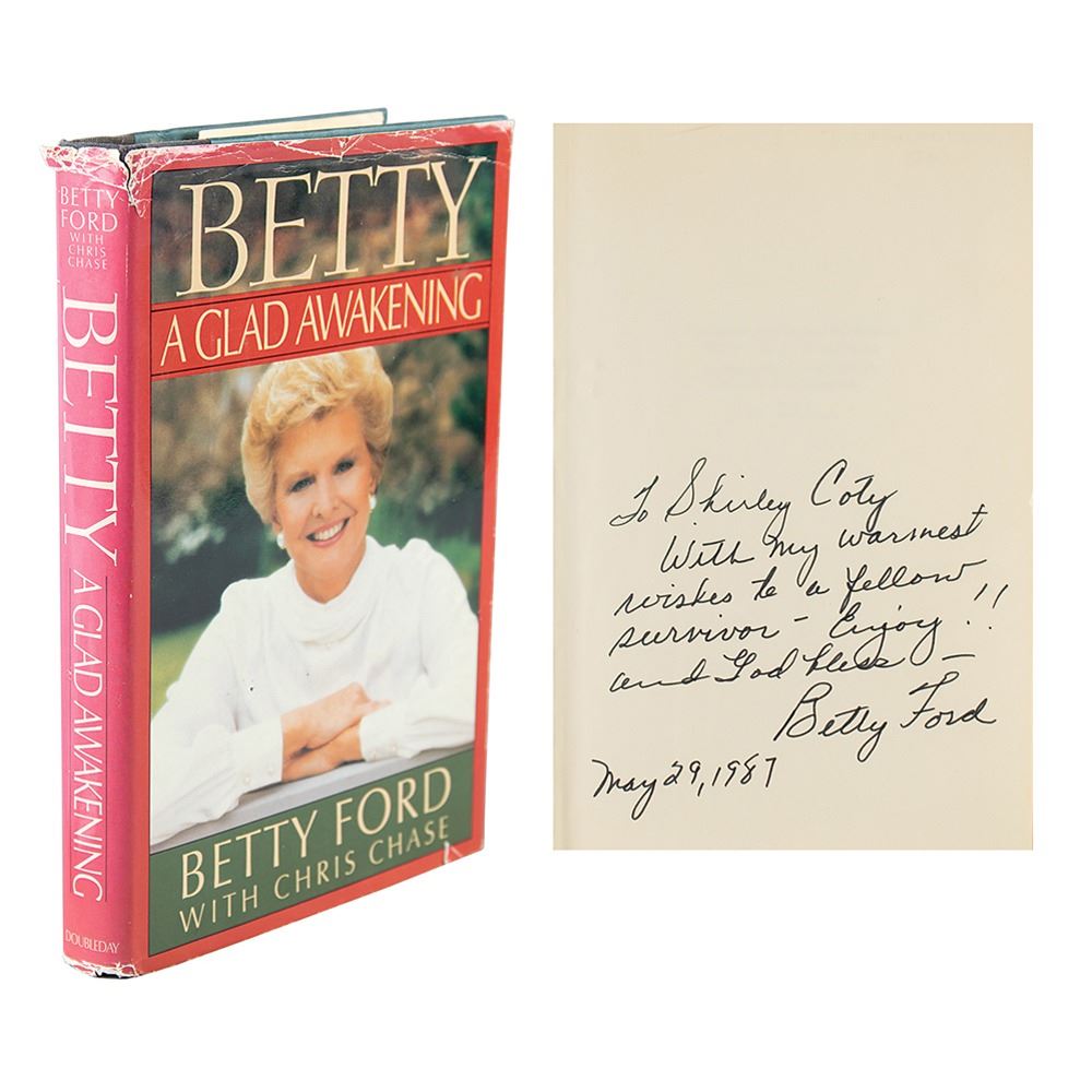 Signed book: Betty: A Glad Awakening. Limited first edition, numbered 271/300. NY: Doubleday, 1987. Hardcover with dust jacket, 6.5 x 9.5, 217 pages. Signed and inscribed on the first free end page in black felt tip, "To Shirley Coty, with my warmest wishes to a fellow survivor—Enjoy!! and God bless—Betty Ford, May 29, 1987." In very good to fine condition, with wear and creasing to the dust jacket.