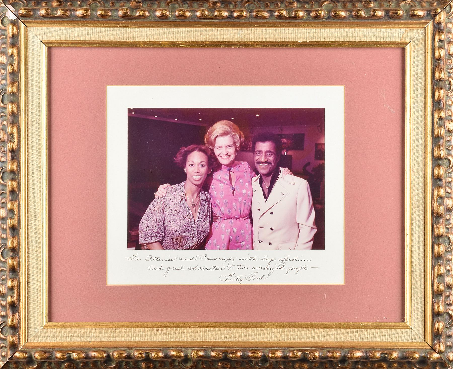 Color satin-finish 9.75 x 7 photo of Betty Ford posing with Sammy Davis, Jr., and his wife Altovise, affixed to a 11.5 x 9.75 mount, signed and inscribed on the mount in ink, "To Altovise and Sammy, with deep affection and great admiration to two wonderful people—Betty Ford.” Ornately matted and framed to an overall size of 22.25 x 18.25. In fine condition.