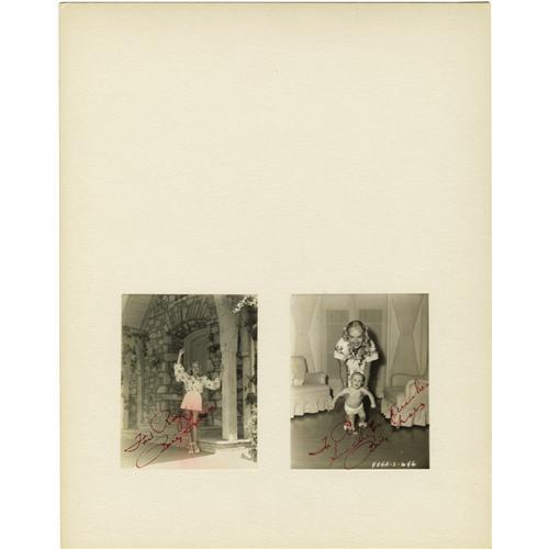 <B>Betty Grable Signed Photos.</B></I> A pair of b&w 3.5" x 4.5" photos inscribed and signed by the actress in red ink. In Excellent condition with very light smearing to the ink, matted to an overall size of 11" x 14". <I>Accompanied by LOA from PSA/DNA.</B></I><BR><BR><b>Shipping:</b> Flat Material, Small (<a target="_blank" href="http://www.heritageauctions.com/common/shipping.php">view shipping information</a>) <BR><BR><B>Important notic