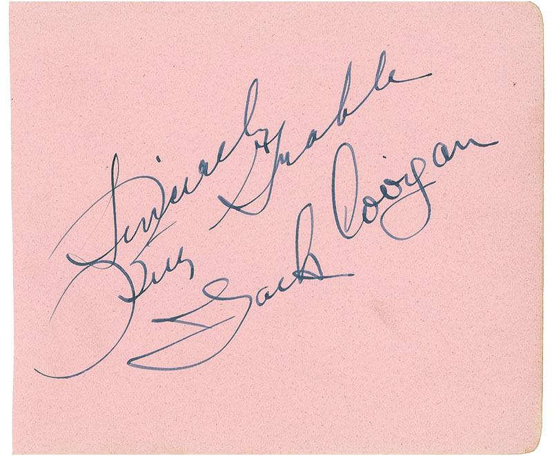 Vintage fountain pen signature, “Sincerely, Betty Grable,” and “Jack Coogan,” on a light pink 5.25 x 4.5 album page. Accompanied by an unsigned photo of the couple. In fine condition.