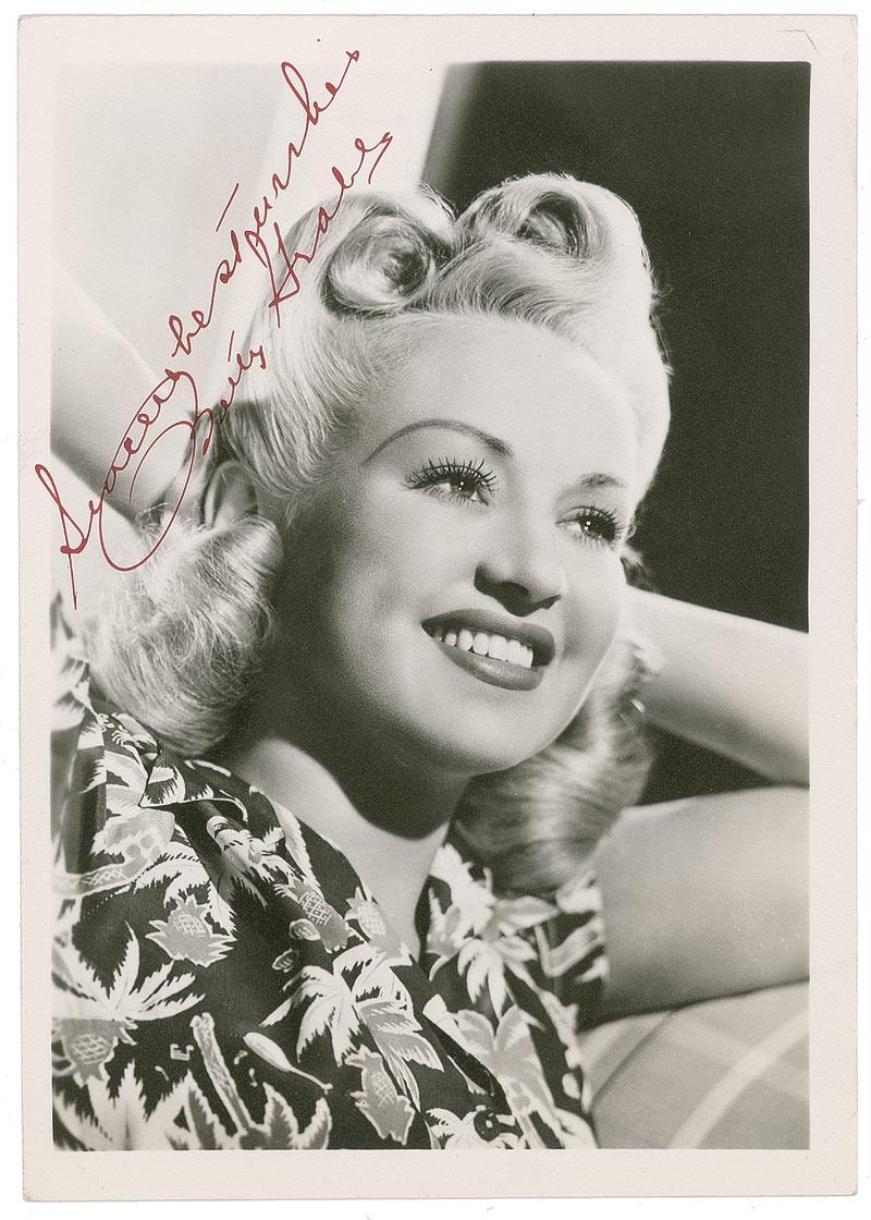 Vintage matte-finish 5 x 7 photo of Grable with her hands behind her head, signed in red fountain pen, “Sincere best wishes, Betty Grable.” In fine condition.