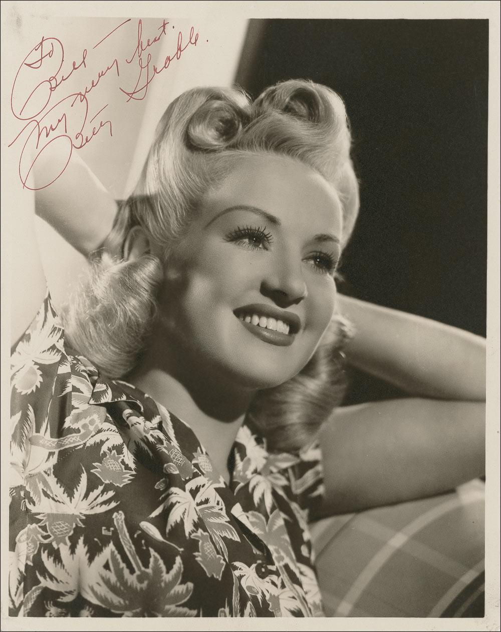Vintage matte-finish 8 x 10 photo of Grable with her hands behind her head, signed and inscribed in red fountain pen “To Bill—My very best, Betty Grable.” In fine condition, with a few light bends and creases to top corners, and a bit of light silvering to background.