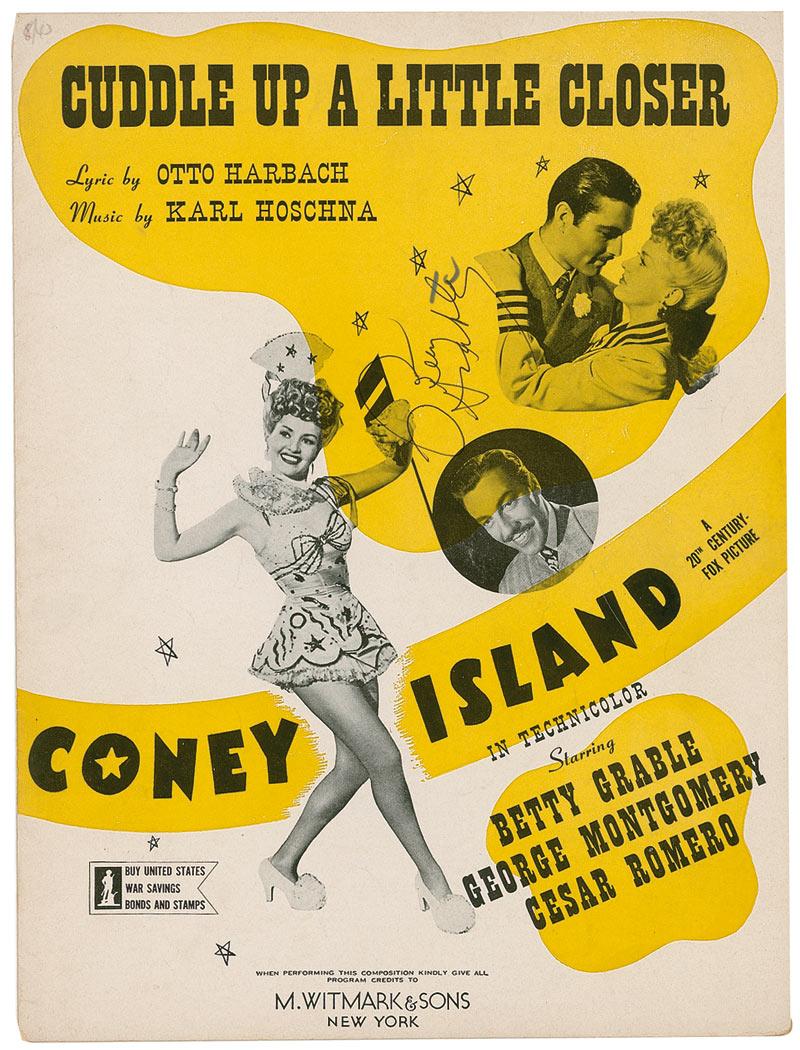 Sheet music for ‘Cuddle Up a Little Closer’ from Coney Island 9 x 12, six pages, signed on the front in black ink by Betty Grable, star of the film. Light handling wear and the end of Grable’s name touching a handwritten 10-cent price notation, otherwise fine condition.