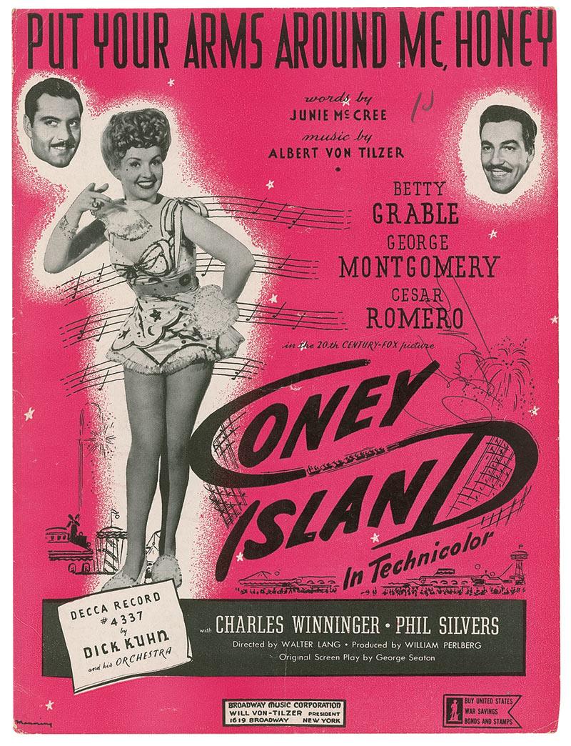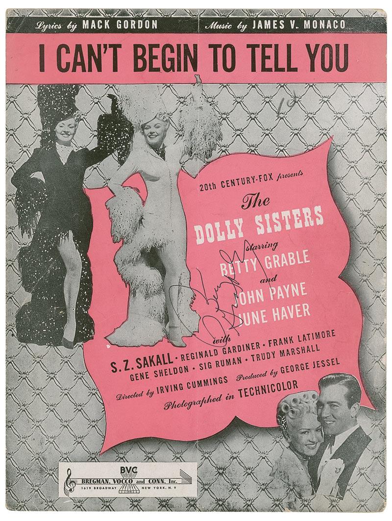 Two sets of sheet music: one for ‘I Can’t Begin To Tell You’ from The Dolly Sisters, 9 x 12, 3 pages, signed vertically on the front cover in blue ink; and one for ‘Put Your Arms Around Me Honey’ from Coney Island, also signed vertically on the cover in blue ink. A central vertical fold to both, light contrast to one signature, and expected age wear, otherwise fine condition.