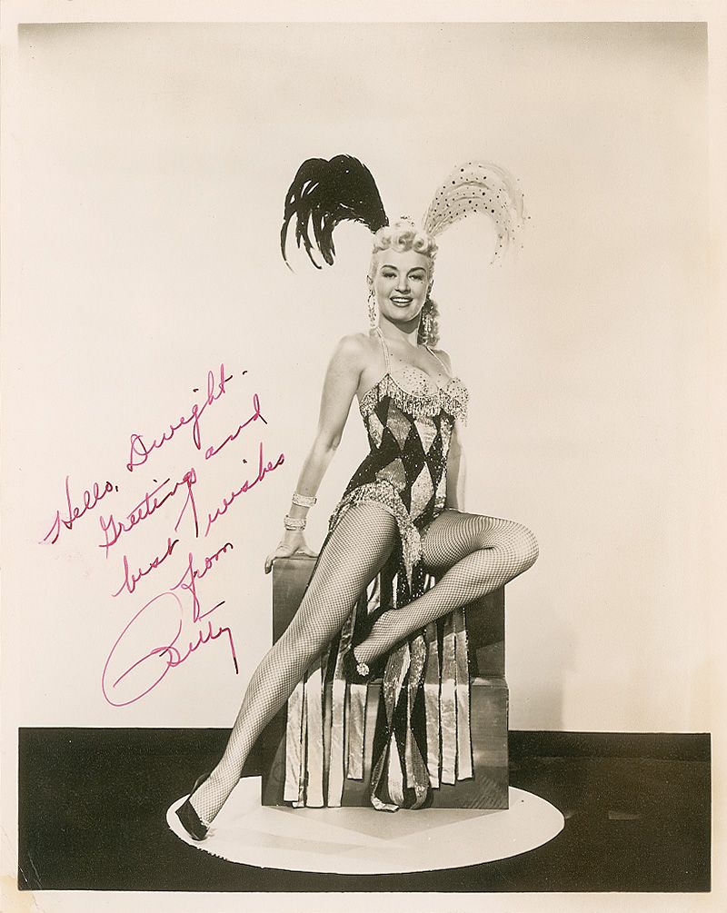 Vintage matte-finish 8 x 10 photo of Grable in a show girl costume, signed and inscribed in red fountain pen “Hello, Dwight—Greetings and best wishes from Betty.” In fine condition, with a few surface impressions and light creases to lower left corner.