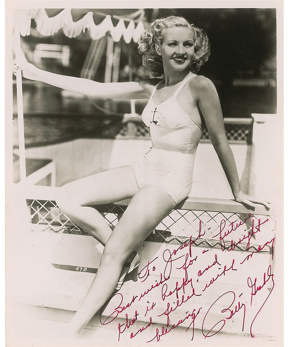 Dazzling vintage glossy 8 x 10 photo of Grable in a one-piece bathing suit showing off her legendary legs, signed and inscribed in red fountain pen “To Joseph, Best wishes for a future that is happy and bright and filled with many blessings. Betty Grable.” In fine condition.