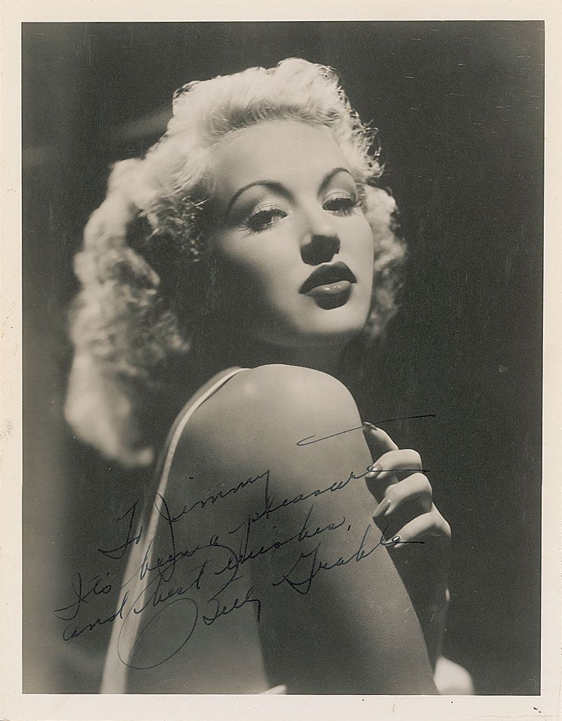 Vintage 7.25 x 9.5 lighter stock, matte-finish photo of Grable bathed in soft light and looking over her shoulder, signed and inscribed in fountain pen, “To Jimmy—It’s been a pleasure and best wishes, Betty Grable.” In fine condition, with a couple light surface marks.