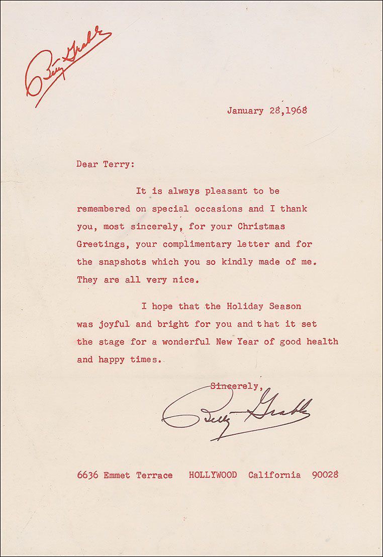 TLS, one page, 7.25 x 10.25, personal letterhead, January 28, 1968. Grable sends thanks for some photos. In part: “It is always pleasant to be remembered on special occasions and I thank you, most sincerely, for your Christmas Greetings, your complimentary letter and for the snapshots which you so kindly made of me.” Some scattered edge and corner creases, otherwise fine condition.