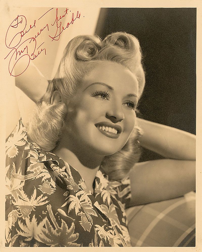 Pretty vintage matte-finish 8 x 10 photo of Grable with an upswept hairdo and Hawaiian blouse, signed and inscribed in red fountain pen, “To Bill—My very best, Betty Grable.” In fine condition, with a few unobtrusive surface creases.