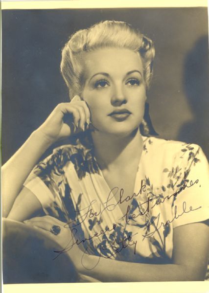 Betty Grable signed 5 x 7 Betty Grable (December 18, 1916 – July 2, 1973) was an American actress, dancer, and singer. Grable was celebrated for having the most beautiful legs in Hollywood and studio publicity widely dispersed photos featuring them. Her iconic bathing suit poster made her the number-one pin-up girl of the World War II era. It was later included in the Life magazine project "100 Photographs that Changed the World". Hosiery specialists of the era often noted the ideal proportions of her legs as thigh (18.5"), calf (12"), and ankle (7.5"). Grable's legs were famously insured by her studio for $1,000,000 with Lloyds of London. Grable appeared in several smash-hit musical films in the 1940s, most notable: Mother Wore Tights in 1947, with frequent co-star Dan Dailey. She came to prominence in 1939 when she signed with Twentieth Century-Fox and signed on to appear opposite Ethel Merman in the Broadway musical Du Barry Was a Lady. But it was not until she was called back to Hollywood to replace Fox's musical queen, Alice Faye, in Down Argentine Way, that she became a household name. She was known by several nicknames during her heyday in the '40s, including "the girl with the million dollar legs," "the quick-silver blonde," "the queen of the Hollywood musical," and "the darling of the forties."
