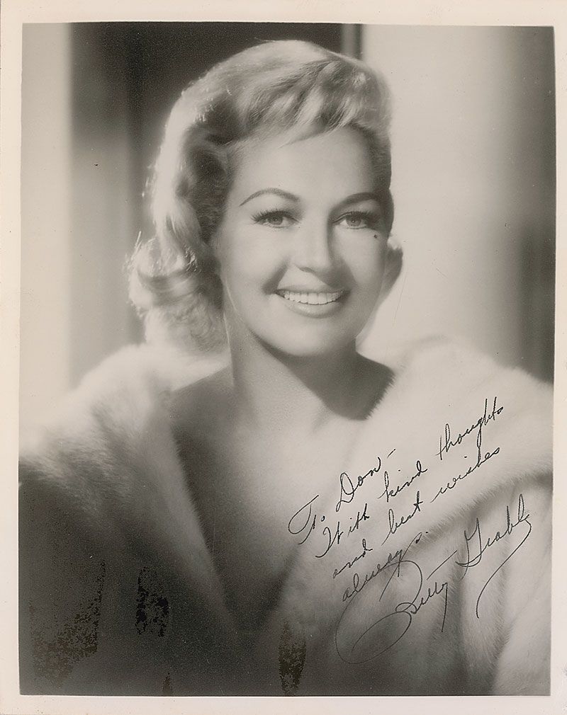 Attractive vintage matte-finish 8 x 10 head-and-shoulders photo of Grable smiling, signed and inscribed in fountain pen, “To Don—With kind thoughts and best wishes always, Betty Grable.” Multiple dings to the right edge and irregularities to the finish on the left side, otherwise fine condition.
