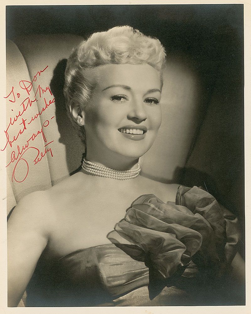 Pretty vintage matte-finish 8 x 10 photo of Grable in a strapless gown, signed and inscribed in red ink, “To Don, with my best wishes always—Betty.” In fine condition.