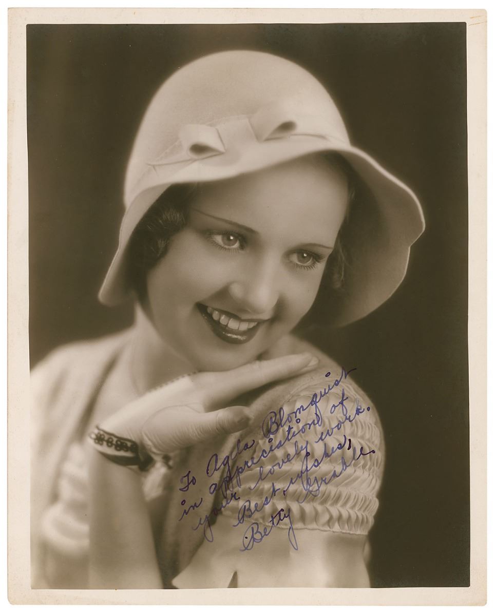 Gorgeous vintage matte-finish 8 x 10 photo of a smiling Grable at the age of sixteen, signed and inscribed in fountain pen, “To Agla Blomquist in appreciation of your lovely work. Best wishes, Betty Grable.” In fine condition.