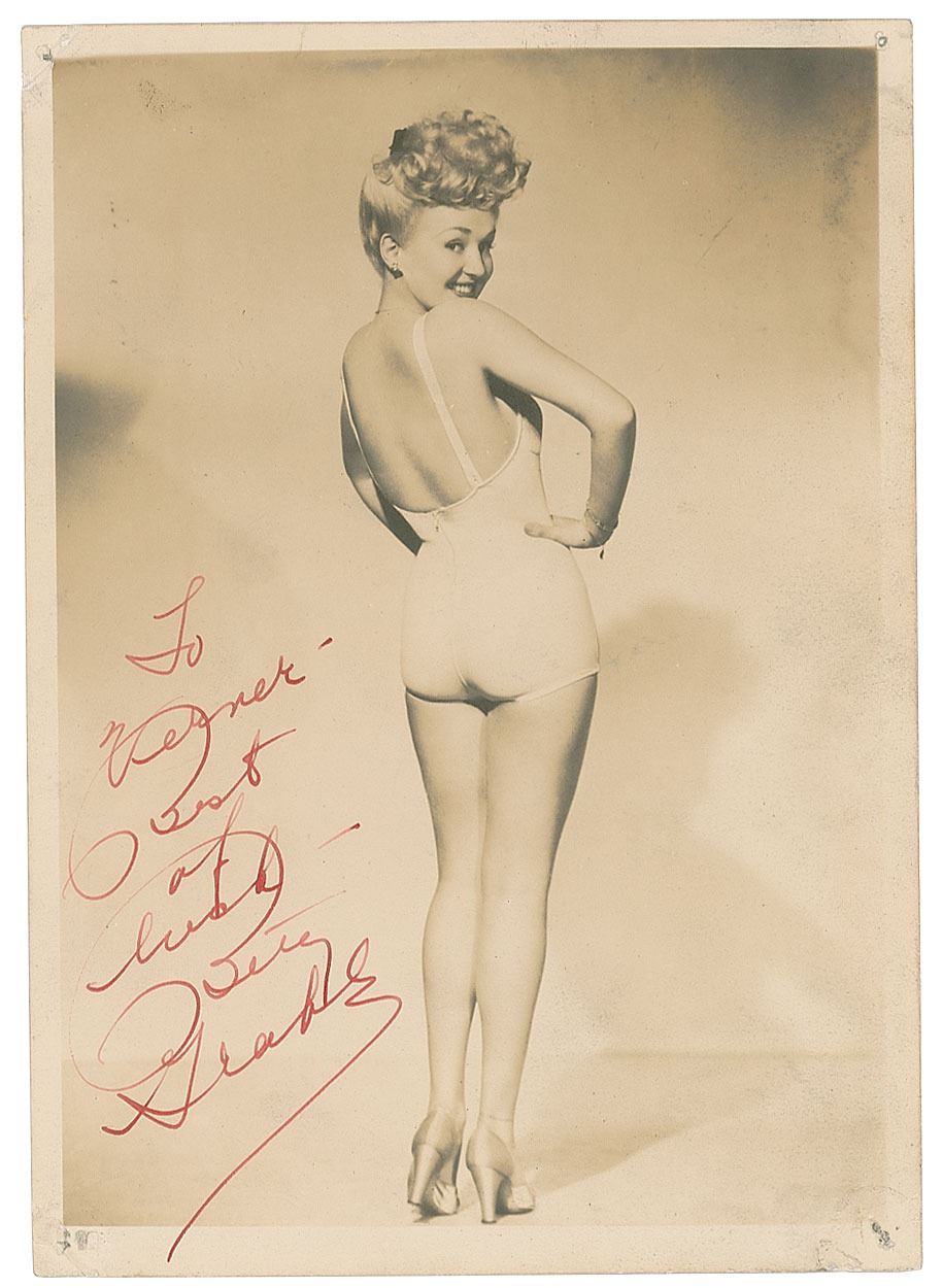 Classic vintage matte-finish 5 x 7 photo of Grable turning to look over her shoulder, signed and inscribed in red fountain pen, "To Verner—Best of luck—Betty Grable.” In very good to fine condition, with light dampstaining to the upper right edge, and tack holes to all four corners.