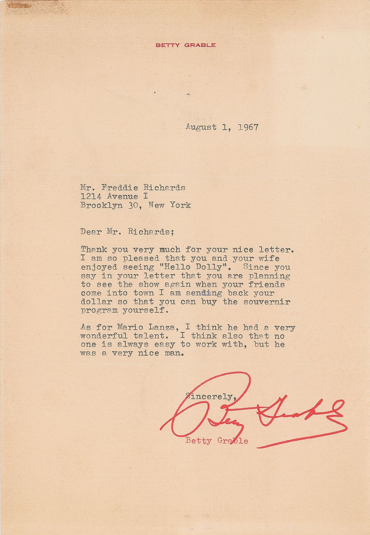 Two items: a matte-finish 8 x 10 paperstock photo of Grable as the title character in the 1967 production of Hello, Dolly!, signed and inscribed in black felt tip, "To Freddie, Best always, Betty Grable"; and a TLS, one page, 7.25 x 10.5, personal letterhead, August 1, 1967, addressed to Freddie Richards, in part: "I am so pleased that you and your wife enjoyed seeing 'Hello Dolly.' Since you say in your letter that you are planning to see the show again when your friends come into town I am sending back your dollar so that you can buy the souvenir program yourself. As for Mario Lanza, I think he had a very wonderful talent. I think also that no one is always easy to work with, but he was a very nice man.". In overall fine condition, with an old tape stain to the top edge of the letter. Grable famously played the part of Dolly in the Broadway production of Hello, Dolly! from June 12, 1967 to November 5, 1967.