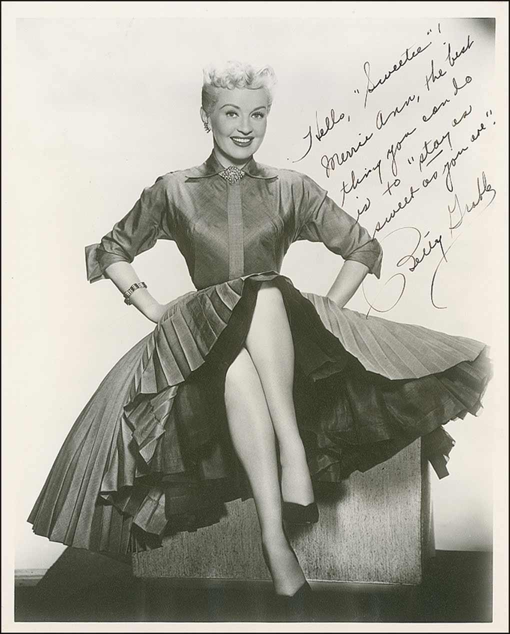 Vintage matte-finish 8 x 10 photo of Grable showing off her famous legs, signed and inscribed in fountain pen “Hello ‘Sweetie’! Merrie Ann, the best thing you can do is to ‘stay as sweet as you are.’ Betty Grable.” In fine condition, with light rippling to horizontal edges.