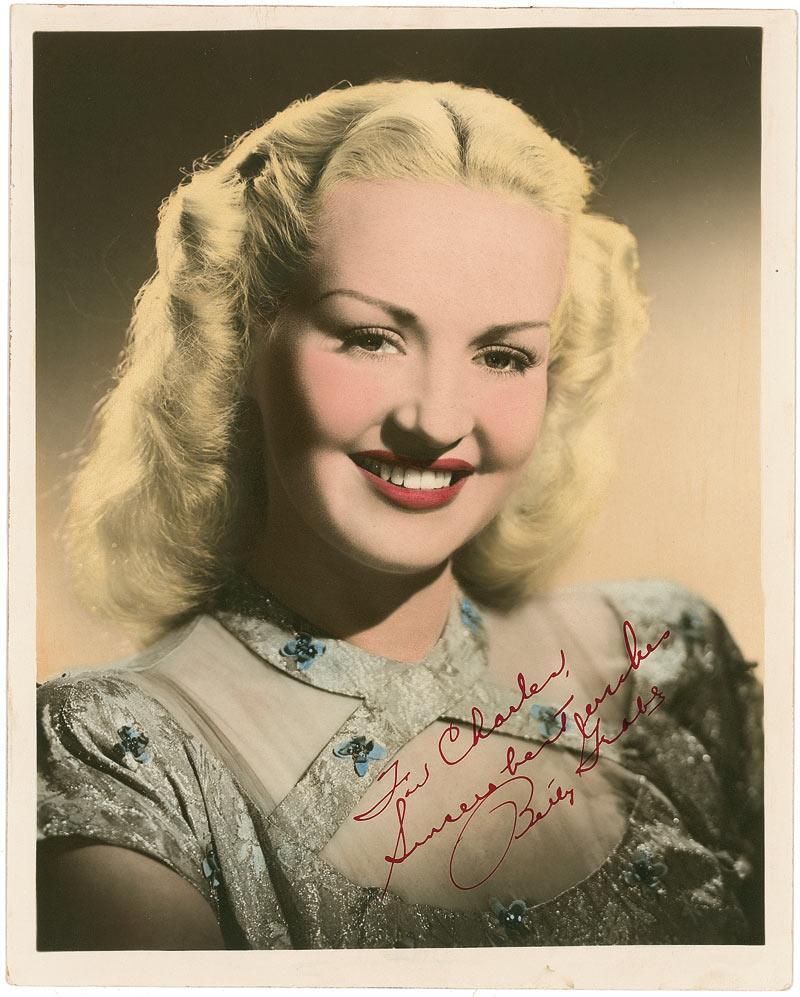 Lovely color-tinted vintage matte-finish 8 x 10 photo, signed and inscribed in red ink “For Charles, Sincere best wishes, Betty Grable.” In fine condition, with some light edge rippling. Pre-certified PSA/DNA and RRAuction COA.
