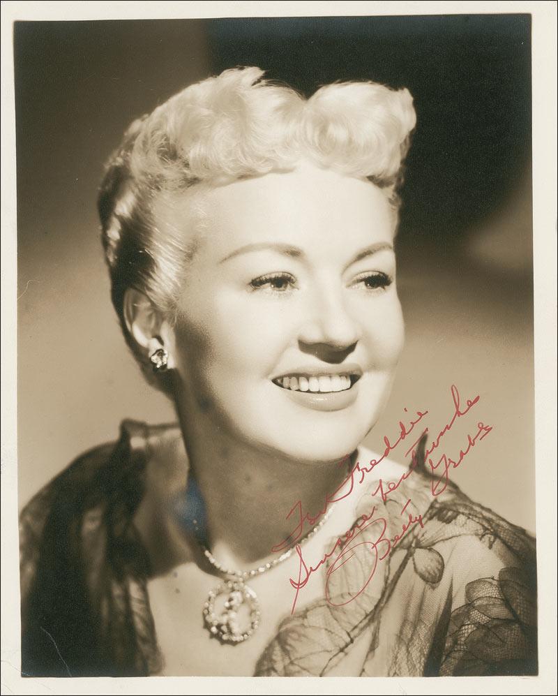 Lovely vintage sepia matte-finish 8 x 10 photo, signed and inscribed in red fountain pen “For Freddie, Sincere best wishes, Betty Grable.” In fine condition, with light creases to lower left corner, and some light silvering to darker areas of image and background.