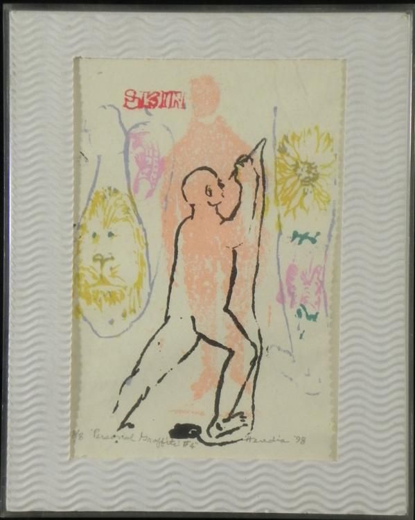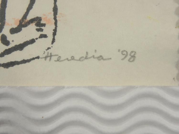 This print shows several images, including a man, flower and a lion's head. All are images with personal meaning to the artist, and form part of the "graffiti" of her artistic vision. * * * Artist: Betty Heredia Signature: "Heredia" in pencil, lower rightTitle: Personal Graffiti #4Edition: Numbered 8/8Medium: Serigraph and styrafoam on paper Size: 8 x 10 inches Presentation: In clear plastic box frame with corrugated wave pattern paper borderCondition: Very goodCertificate of Authenticity: Included * Midwest Estate Buyers has been entrusted by the estate of Elizabeth (Betty) Heredia (Shapiro) Snyder Rees to offer her personal artwork for public sale. Due to the rapidity that Elizabeth's artwork was sold commercially, this represents a treasure trove * of her personal work as submitted by her son. It was her wish and legacy that others should enjoy what she enjoyed. * * * * * Elizabeth's previous work was sold as rapidly as it became available. We consider this a unique opportunity to take recognition of an enormous talent. Her personal portfolios have now been opened up to reveal a variety of marvelous work, full of color * and expression. * * As in the past, her work has appreciated considerably with time. * * Betty was a multi-dimensional artist. She was well versed in classic oil painting, water color, wax pencil, charcoal, sumi ink, drawing, hand made paper sculpture, paper mache, clay, wood, marble, printmaking, wood cuts, linoleum block, etching, monotype, serigraph, * and multi-media silk screen. * Elizabeth attended the Tyler School of Art at Temple University, and studied under the founder, Boris Blai, and printmaker Arthur Flourie. * * * * * Her work was first shown in California at Stanford University Museum of Art on campus. Many pieces were gifted to museums, including the Palace of the Legion of Honor, San Francisco, CA; Oakland Museum, Oakland, CA; Grand Rapids Museum of Art, Grand Rapids, * MI; and according to the estate, the National Museum of American History Art Smithsonian Institution, Washington, DC. She received a deed of gift, certificate number 26800, dated 8/17/2001. * * Betty's work was known on the San Francisco Peninsula through the San Francisco Women Artists and Bay Area Printmakers Society and was juried into the California State Fair in 1956 and 1957. Betty taught at the Pacific Grove Art Center, and the Monterey * Museum of Art, and also had exhibits of her work at these fine institutions. She was featured in a one person show at the Cherry Foundation in Carmel. * * She was compared to the then greatest living Cubist artist Richard Diebenkorn. Gehan Salinger, art critic of the San Francisco Chronicle for 25 years, referred to Elizabeth as "an unqualified genius." * * * Her art has sold in galleries in Amsterdam and Barcelona to Europeans for their personal collections for many years. She had a solo show in Tokyo, Japan, and another in Denmark. * * * A few of her pieces can be found in public art schools. Also, an oil painting of a marching band is in a special school for the deaf in Daley City, California. * * Betty passed away at the age of 91. * * She left behind her wonderful collection of original art. We are glad to bring it to you at what we consider to be very competitive opening bids for such fine artwork. * * *