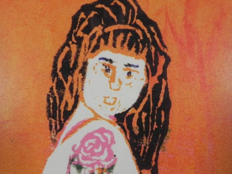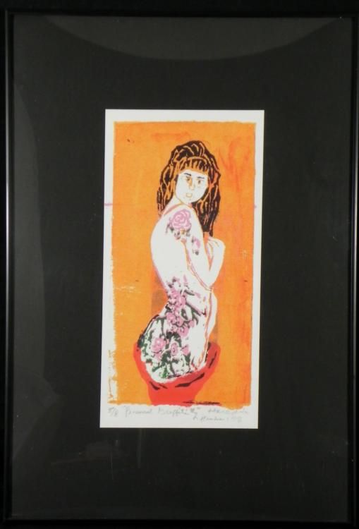 This print portray's artist's idea of graffiti on one's person--tattoos, in a nice print. Artist: Betty HerediaSignature: "Heredia," in pencil, lower rightTitle: Personal Graffiti #2Edition: Limited edition reproductionDate: 1998Medium: Linocut and serigraph on paper Image size: 8 1/2 x 17 inches Framing: On a black background in a matte black frameFrame size: 18 3/4 x 27 1/4 inchesCondition: Very good; some wear to the edges of the frameCertificate of Authenticity: Included Midwest Estate Buyers has been entrusted by the estate of Elizabeth (Betty) Heredia (Shapiro) Snyder Rees to offer her personal artwork for public sale. Due to the rapidity that Elizabeth's artwork was sold commercially, this represents a treasure trove of her personal work as submitted by her son. It was her wish and legacy that others should enjoy what she enjoyed. Elizabeth's previous work was sold as rapidly as it became available. We consider this a unique opportunity to take recognition of an enormous talent. Her personal portfolios have now been opened up to reveal a variety of marvelous work, full of color and expression. As in the past, her work has appreciated considerably with time. Betty was a multi-dimensional artist. She was well versed in classic oil painting, water color, wax pencil, charcoal, sumi ink, drawing, hand made paper sculpture, paper mache, clay, wood, marble, printmaking, wood cuts, linoleum block, etching, monotype, serigraph, and multi-media silk screen. Elizabeth attended the Tyler School of Art at Temple University, and studied under the founder, Boris Blai, and printmaker Arthur Flourie. Her work was first shown in California at Stanford University Museum of Art on campus. Many pieces were gifted to museums, including the Palace of the Legion of Honor, San Francisco, CA; Oakland Museum, Oakland, CA; Grand Rapids Museum of Art, Grand Rapids, MI; and according to the estate, the National Museum of American History Art Smithsonian Institution, Washington, DC. She received a deed of gift, certificate number 26800, dated 8/17/2001. Betty's work was known on the San Francisco Peninsula through the San Francisco Women Artists and Bay Area Printmakers Society and was juried into the California State Fair in 1956 and 1957. Betty taught at the Pacific Grove Art Center, and the Monterey Museum of Art, and also had exhibits of her work at these fine institutions. She was featured in a one person show at the Cherry Foundation in Carmel. She was compared to the then greatest living Cubist artist Richard Diebenkorn. Gehan Salinger, art critic of the San Francisco Chronicle for 25 years, referred to Elizabeth as "an unqualified genius." Her art has sold in galleries in Amsterdam and Barcelona to Europeans for their personal collections for many years. She had a solo show in Tokyo, Japan, and another in Denmark. A few of her pieces can be found in public art schools. Also, an oil painting of a marching band is in a special school for the deaf in Daley City, California. Betty passed away at the age of 91. She left behind her wonderful collection of original art. We are glad to bring it to you at what we consider to be very competitive opening bids for such fine artwork.