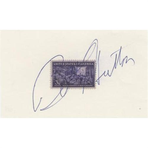 <B>Betty Hutton Autograph.</B></I> A 3" x 5" card, with a three-cent commemorative postage stamp affixed, signed by Betty Hutton in blue ink. Hutton's autograph extends across the face of the stamp and is large and clean. In Excellent condition.<BR><BR><b>Shipping:</b> Flat Material, Small (<a target="_blank" href="http://www.heritageauctions.com/common/shipping.php">view shipping information</a>)