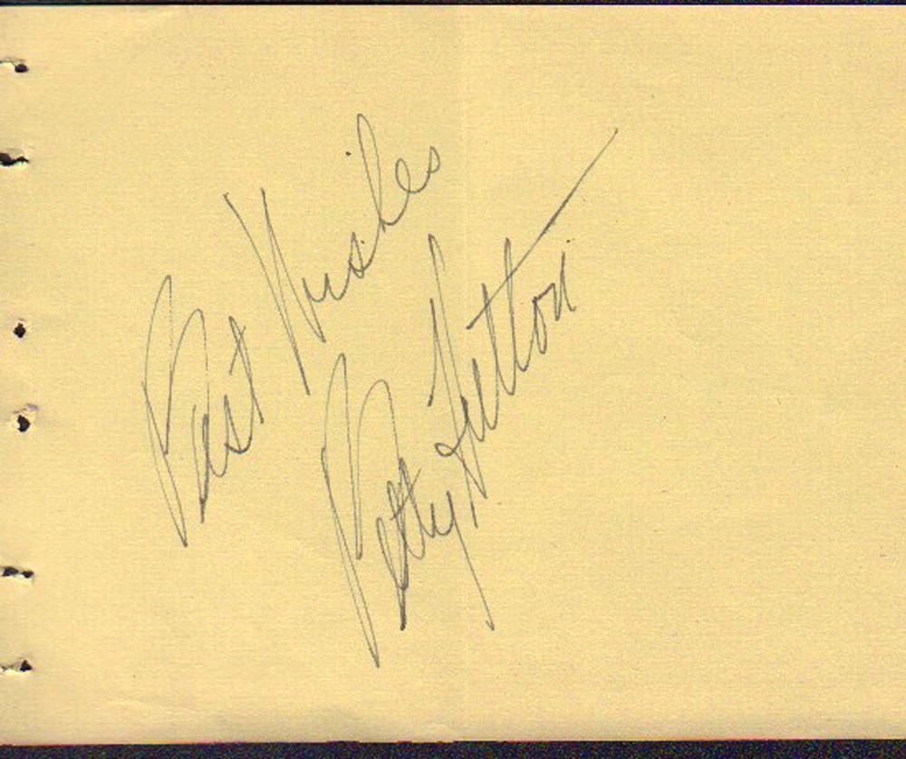 Autograph book page signed by Betty Hutton. The page had been folded in half at some point. All items come with a certificate of authenticity good for the life of the piece.