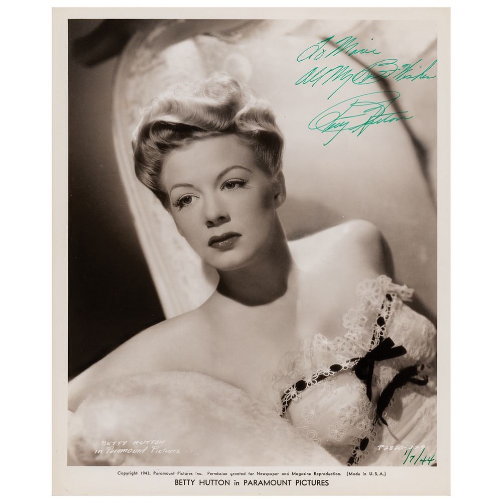 Vintage glossy 8.25 x 10 Paramount Pictures publicity photo of Hutton seated in a lacy floral top, signed and inscribed in green fountain pen, "To Marie, All my best wishes, Betty Hutton.‰Û In fine condition.