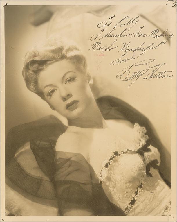 Vintage matte-finish 8 x 10 photo, signed and inscribed in fountain pen “To Patty, Thanks For Making Me So Wonderful, Love, Betty Hutton.” In fine condition, with corner soiling and some light soiling to background around the inscription. According to the consignor the original recipient was Hutton’s stunt double.