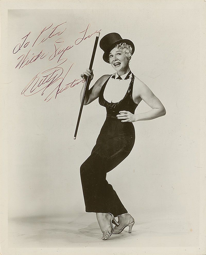Vintage glossy 8 x 10 photo of Hutton dancing in a top hat and white collar, signed and inscribed in black ink, “To Peter, With deep love, Betty Hutton.” In fine condition, with some scattered light creases.