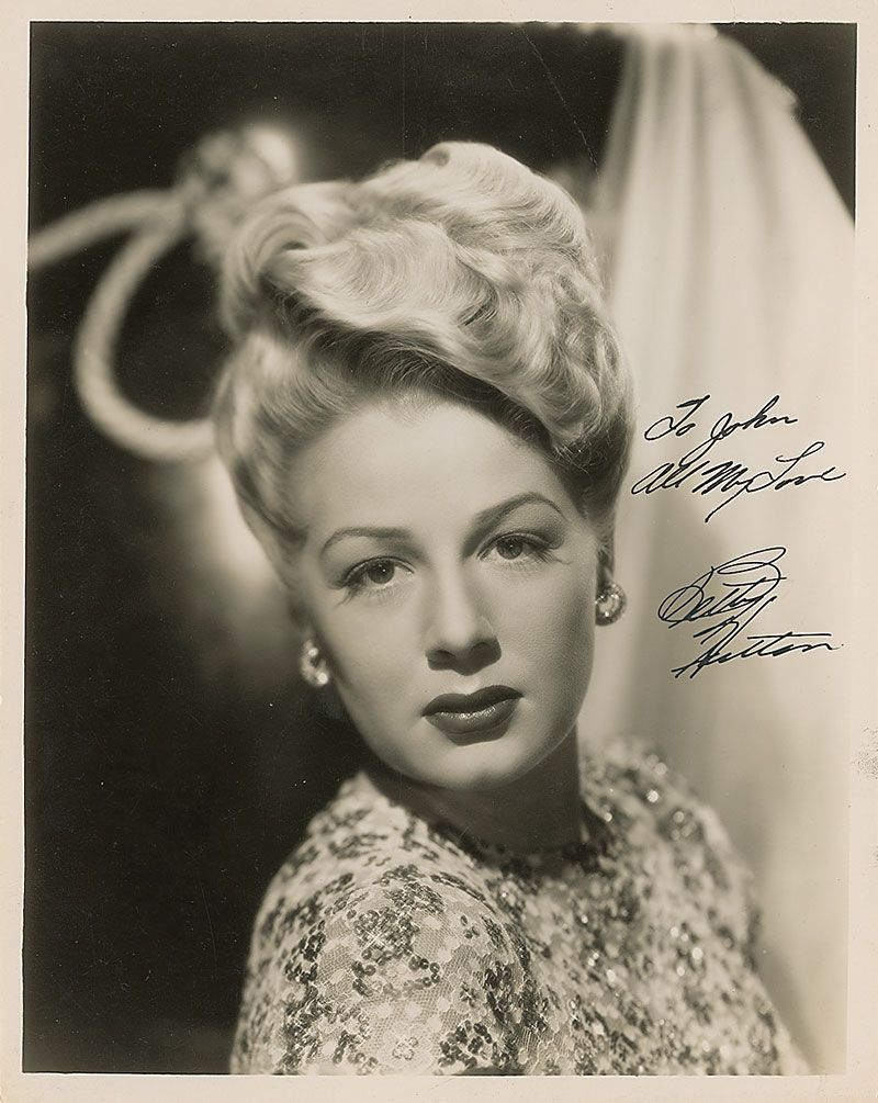 Glamorous vintage pearl-finish 8 x 10 photo, signed and inscribed in fountain pen, “To John, all my love, Betty Hutton.” A few scattered vertical bends and creases, otherwise fine condition.