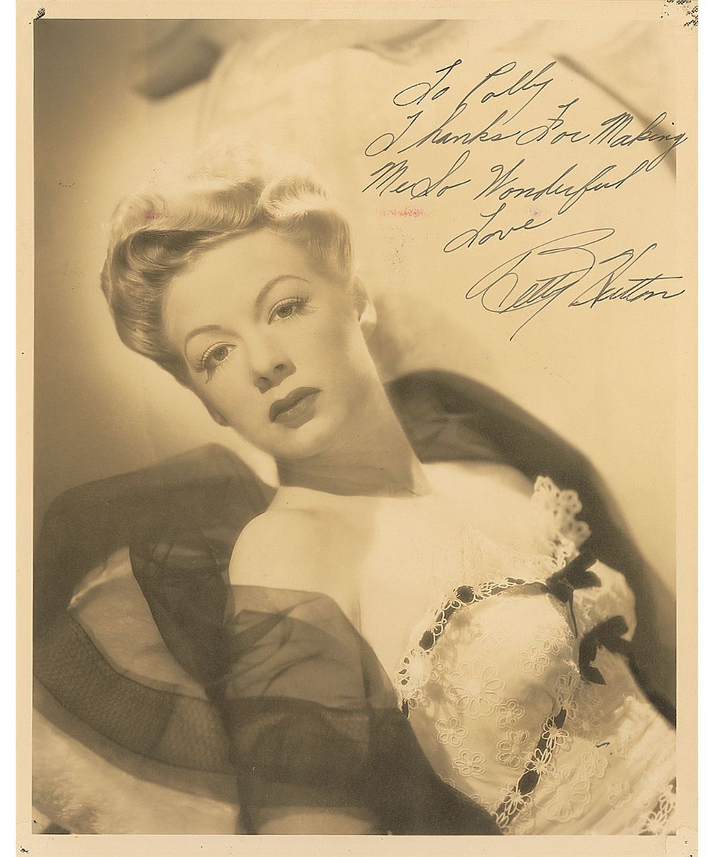Vintage matte-finish 8 x 10 photo of Hutton in a lacy top, signed and inscribed in fountain pen, “To Patty, Thanks For Making Me So Wonderful, Love, Betty Hutton.” In fine condition, with adhesive remnants to corners and a stray red mark below the inscription. Consignor notes that the original recipient was Hutton’s stunt double.