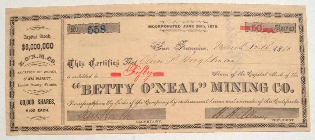 This rare stock is numbered 558 for 50 shares in 1881 to Oliver Brightman and signed by president H. H. Allen and secretary R. Heath. Uncancelled. The mine was located 12 miles southwest of Battle Mountain in the Shoshone Range. The mining district was discovered in 1847 and the Betty O'Neal was first mined in 1880. The mine produced gold and silver. City: LewisCounty: LanderState: NV