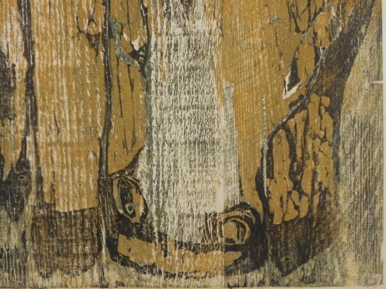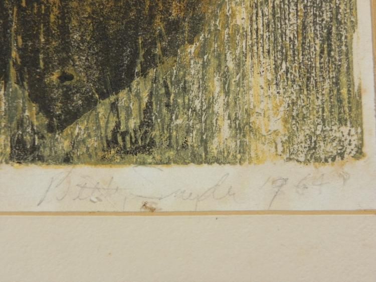 This is a print of a bull cow, done with lots of textures. Artist: Betty Snyder Signature: "Betty Snyder" in pencil, lower rightTitle: "La Vache"Edition: 5/7Year 1964Medium: Multi-colored woodcut block print, elimination process, on thin wove paper Image size: 14 x 17 inches Presentation: In matte board with backingBoard size: 20 x 24 inches Condition: Very good, with surface wear, lower margin Certificate of Authenticity: Included Midwest Estate Buyers has been entrusted by the estate of Elizabeth (Betty) Heredia (Shapiro) Snyder Rees to offer her personal artwork for public sale. Due to the rapidity that Elizabeth's artwork was sold commercially, this represents a treasure trove of her personal work as submitted by her son. It was her wish and legacy that others should enjoy what she enjoyed. Elizabeth's previous work was sold as rapidly as it became available. We consider this a unique opportunity to take recognition of an enormous talent. Her personal portfolios have now been opened up to reveal a variety of marvelous work, full of color and expression. As in the past, her work has appreciated considerably with time. Betty was a multi-dimensional artist. She was well versed in classic oil painting, water color, wax pencil, charcoal, sumi ink, drawing, hand made paper sculpture, paper mache, clay, wood, marble, printmaking, wood cuts, linoleum block, etching, monotype, serigraph, and multi-media silk screen. Elizabeth attended the Tyler School of Art at Temple University, and studied under the founder, Boris Blai, and printmaker Arthur Flourie. Her work was first shown in California at Stanford University Museum of Art on campus. Many pieces were gifted to museums, including the Palace of the Legion of Honor, San Francisco, CA; Oakland Museum, Oakland, CA; Grand Rapids Museum of Art, Grand Rapids, MI; and according to the estate, the National Museum of American History Art Smithsonian Institution, Washington, DC. She received a deed of gift, certificate number 26800, dated 8/17/2001. Betty's work was known on the San Francisco Peninsula through the San Francisco Women Artists and Bay Area Printmakers Society and was juried into the California State Fair in 1956 and 1957. Betty taught at the Pacific Grove Art Center, and the Monterey Museum of Art, and also had exhibits of her work at these fine institutions. She was featured in a one person show at the Cherry Foundation in Carmel. She was compared to the then greatest living Cubist artist Richard Diebenkorn. Gehan Salinger, art critic of the San Francisco Chronicle for 25 years, referred to Elizabeth as "an unqualified genius." Her art has sold in galleries in Amsterdam and Barcelona to Europeans for their personal collections for many years. She had a solo show in Tokyo, Japan, and another in Denmark. A few of her pieces can be found in public art schools. Also, an oil painting of a marching band is in a special school for the deaf in Daley City, California. Betty passed away at the age of 91. She left behind her wonderful collection of original art. We are glad to bring it to you at what we consider to be very competitive opening bids for such fine artwork.