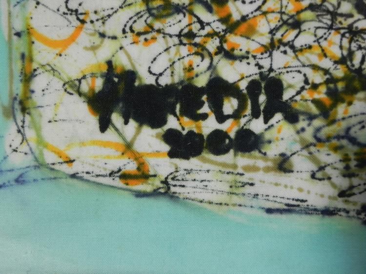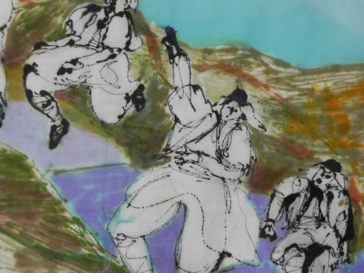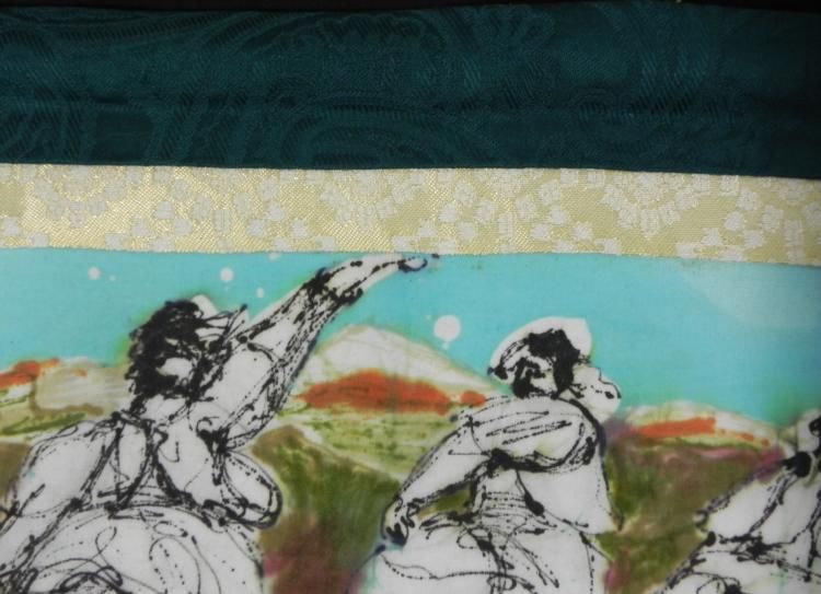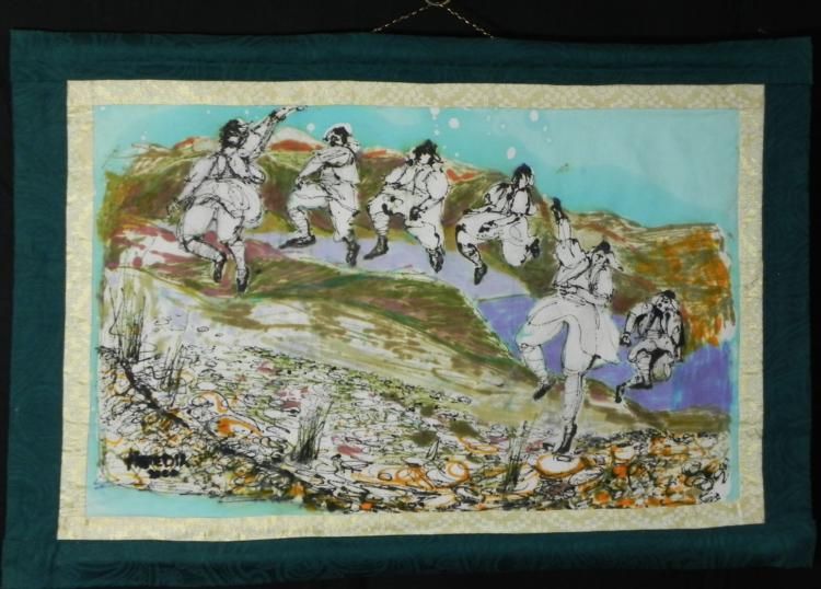 This is a rare original batik painting by artist Betty Snyder Rees. A series of dancing figures are portrayed here, full of movement in their flowing lines. The background is has much detail. Artist: Betty Heredia Snyder Rees Signature: Signed "Heredia," lower rightMedium: Batik painting on cottonSize: 22 x 34 inches Presentation: Matted in white and gold patterned fabric, with turquoise patterned fabric "framing"; inner wooden hanging rods, top and bottom Date: 1999Condition: Excellent Certificate of Authenticity: Included Midwest Estate Buyers has been entrusted by the estate of Elizabeth (Betty) Heredia (Shapiro) Snyder Rees to offer her personal artwork for public sale. Due to the rapidity that Elizabeth's artwork was sold commercially, this represents a treasure trove of her personal work as submitted by her son. It was her wish and legacy that others should enjoy what she enjoyed. Elizabeth's previous work was sold as rapidly as it became available. We consider this a unique opportunity to take recognition of an enormous talent. Her personal portfolios have now been opened up to reveal a variety of marvelous work, full of color and expression. As in the past, her work has appreciated considerably with time. Betty was a multi-dimensional artist. She was well versed in classic oil painting, water color, wax pencil, charcoal, sumi ink, drawing, hand made paper sculpture, paper mache, clay, wood, marble, printmaking, wood cuts, linoleum block, etching, monotype, serigraph, and multi-media silk screen. Elizabeth attended the Tyler School of Art at Temple University, and studied under the founder, Boris Blai, and printmaker Arthur Flourie. Her work was first shown in California at Stanford University Museum of Art on campus. Many pieces were gifted to museums, including the Palace of the Legion of Honor, San Francisco, CA; Oakland Museum, Oakland, CA; Grand Rapids Museum of Art, Grand Rapids, MI; and according to the estate, the National Museum of American History Art Smithsonian Institution, Washington, DC. She received a deed of gift, certificate number 26800, dated 8/17/2001. Betty's work was known on the San Francisco Peninsula through the San Francisco Women Artists and Bay Area Printmakers Society and was juried into the California State Fair in 1956 and 1957. Betty taught at the Pacific Grove Art Center, and the Monterey Museum of Art, and also had exhibits of her work at these fine institutions. She was featured in a one person show at the Cherry Foundation in Carmel. She was compared to the then greatest living Cubist artist Richard Diebenkorn. Gehan Salinger, art critic of the San Francisco Chronicle for 25 years, referred to Elizabeth as "an unqualified genius." Her art has sold in galleries in Amsterdam and Barcelona to Europeans for their personal collections for many years. She had a solo show in Tokyo, Japan, and another in Denmark. A few of her pieces can be found in public art schools. Also, an oil painting of a marching band is in a special school for the deaf in Daley City, California. Betty passed away at the age of 91. She left behind her wonderful collection of original art. We are glad to bring it to you at what we consider to be very competitive opening bids for such fine artwork.