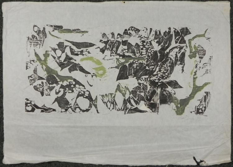 This study of trees plays into the negative space amongst the leaves and branches, creating a wonderful, natural pattern. Artist: Betty Snyder ReesSignature: "Betty Snyder," in pencil, lower rightTitle: Through the TreesMedium: Mult-colored woodcut block print on paper, elimination processSheet size: 21 x 29 inches Edition: 7/9Year: 1964Condition: Very good; creases and wrinkling to the paper, some edge tears could be matted outCertificate of Authenticity: Included Midwest Estate Buyers has been entrusted by the estate of Elizabeth (Betty) Heredia (Shapiro) Snyder Rees to offer her personal artwork for public sale. Due to the rapidity that Elizabeth's artwork was sold commercially, this represents a treasure trove of her personal work as submitted by her son. It was her wish and legacy that others should enjoy what she enjoyed. Elizabeth's previous work was sold as rapidly as it became available. We consider this a unique opportunity to take recognition of an enormous talent. Her personal portfolios have now been opened up to reveal a variety of marvelous work, full of color and expression. As in the past, her work has appreciated considerably with time. Betty was a multi-dimensional artist. She was well versed in classic oil painting, water color, wax pencil, charcoal, sumi ink, drawing, hand made paper sculpture, paper mache, clay, wood, marble, printmaking, wood cuts, linoleum block, etching, monotype, serigraph, and multi-media silk screen. Elizabeth attended the Tyler School of Art at Temple University, and studied under the founder, Boris Blai, and printmaker Arthur Flourie. Her work was first shown in California at Stanford University Museum of Art on campus. Many pieces were gifted to museums, including the Palace of the Legion of Honor, San Francisco, CA; Oakland Museum, Oakland, CA; Grand Rapids Museum of Art, Grand Rapids, MI; and according to the estate, the National Museum of American History Art Smithsonian Institution, Washington, DC. She received a deed of gift, certificate number 26800, dated 8/17/2001. Betty's work was known on the San Francisco Peninsula through the San Francisco Women Artists and Bay Area Printmakers Society and was juried into the California State Fair in 1956 and 1957. Betty taught at the Pacific Grove Art Center, and the Monterey Museum of Art, and also had exhibits of her work at these fine institutions. She was featured in a one person show at the Cherry Foundation in Carmel. She was compared to the then greatest living Cubist artist Richard Diebenkorn. Gehan Salinger, art critic of the San Francisco Chronicle for 25 years, referred to Elizabeth as "an unqualified genius." Her art has sold in galleries in Amsterdam and Barcelona to Europeans for their personal collections for many years. She had a solo show in Tokyo, Japan, and another in Denmark. A few of her pieces can be found in public art schools. Also, an oil painting of a marching band is in a special school for the deaf in Daley City, California. Betty passed away at the age of 91. She left behind her wonderful collection of original art. We are glad to bring it to you at what we consider to be very competitive opening bids for such fine artwork.