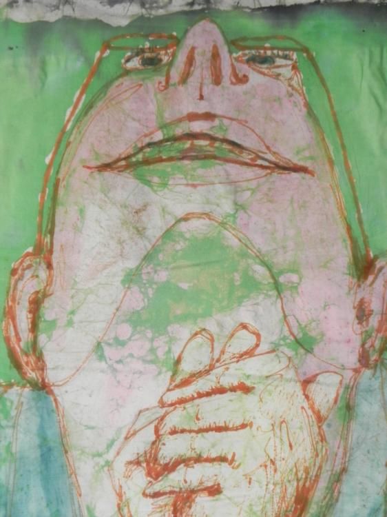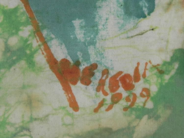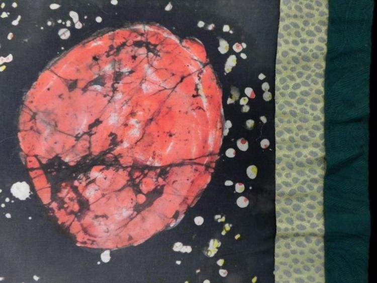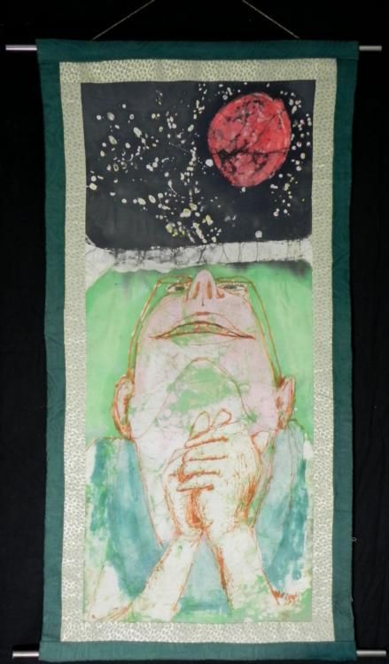 This is a rare original batik painting by artist Betty Snyder Rees. The subject is a person with hands folded, gazing up at the night sky, seemingly searching for the man in the moon. This is a magical portrait, full of wonder. Artist: Betty Heredia Snyder Rees Signature: Signed "Heredia," lower rightMedium: Batik painting on cottonSize: 23 1/2 x 47 inches Presentation: Matted in pearl white patterned fabric, with turquoise patterned fabric "framing"; metal hanging rods, top and bottom Date: 1999Condition: Excellent Certificate of Authenticity: Included Midwest Estate Buyers has been entrusted by the estate of Elizabeth (Betty) Heredia (Shapiro) Snyder Rees to offer her personal artwork for public sale. Due to the rapidity that Elizabeth's artwork was sold commercially, this represents a treasure trove of her personal work as submitted by her son. It was her wish and legacy that others should enjoy what she enjoyed. Elizabeth's previous work was sold as rapidly as it became available. We consider this a unique opportunity to take recognition of an enormous talent. Her personal portfolios have now been opened up to reveal a variety of marvelous work, full of color and expression. As in the past, her work has appreciated considerably with time. Betty was a multi-dimensional artist. She was well versed in classic oil painting, water color, wax pencil, charcoal, sumi ink, drawing, hand made paper sculpture, paper mache, clay, wood, marble, printmaking, wood cuts, linoleum block, etching, monotype, serigraph, and multi-media silk screen. Elizabeth attended the Tyler School of Art at Temple University, and studied under the founder, Boris Blai, and printmaker Arthur Flourie. Her work was first shown in California at Stanford University Museum of Art on campus. Many pieces were gifted to museums, including the Palace of the Legion of Honor, San Francisco, CA; Oakland Museum, Oakland, CA; Grand Rapids Museum of Art, Grand Rapids, MI; and according to the estate, the National Museum of American History Art Smithsonian Institution, Washington, DC. She received a deed of gift, certificate number 26800, dated 8/17/2001. Betty's work was known on the San Francisco Peninsula through the San Francisco Women Artists and Bay Area Printmakers Society and was juried into the California State Fair in 1956 and 1957. Betty taught at the Pacific Grove Art Center, and the Monterey Museum of Art, and also had exhibits of her work at these fine institutions. She was featured in a one person show at the Cherry Foundation in Carmel. She was compared to the then greatest living Cubist artist Richard Diebenkorn. Gehan Salinger, art critic of the San Francisco Chronicle for 25 years, referred to Elizabeth as "an unqualified genius." Her art has sold in galleries in Amsterdam and Barcelona to Europeans for their personal collections for many years. She had a solo show in Tokyo, Japan, and another in Denmark. A few of her pieces can be found in public art schools. Also, an oil painting of a marching band is in a special school for the deaf in Daley City, California. Betty passed away at the age of 91. She left behind her wonderful collection of original art. We are glad to bring it to you at what we consider to be very competitive opening bids for such fine artwork.