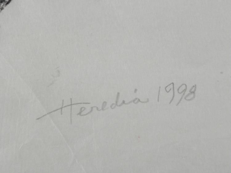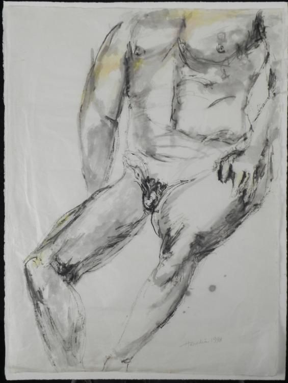 This is an original painting and drawing of a nude seated male figure, done in black and gray, and highlighted in parts with yellow. Artist: Elizabeth HerediaSignature: "Heredia," in pencil, lower rightMedium: Watercolor and charcoal on paper Sheet size: 21 1/2 x 29 inches Year: 1998Condition: Very good- some wrinkling at the edgesCertificate of Authenticity: Included Midwest Estate Buyers has been entrusted by the estate of Elizabeth (Betty) Heredia (Shapiro) Snyder Rees to offer her personal artwork for public sale. Due to the rapidity that Elizabeth's artwork was sold commercially, this represents a treasure trove of her personal work as submitted by her son. It was her wish and legacy that others should enjoy what she enjoyed. Elizabeth's previous work was sold as rapidly as it became available. We consider this a unique opportunity to take recognition of an enormous talent. Her personal portfolios have now been opened up to reveal a variety of marvelous work, full of color and expression. As in the past, her work has appreciated considerably with time. Betty was a multi-dimensional artist. She was well versed in classic oil painting, water color, wax pencil, charcoal, sumi ink, drawing, hand made paper sculpture, paper mache, clay, wood, marble, printmaking, wood cuts, linoleum block, etching, monotype, serigraph, and multi-media silk screen. Elizabeth attended the Tyler School of Art at Temple University, and studied under the founder, Boris Blai, and printmaker Arthur Flourie. Her work was first shown in California at Stanford University Museum of Art on campus. Many pieces were gifted to museums, including the Palace of the Legion of Honor, San Francisco, CA; Oakland Museum, Oakland, CA; Grand Rapids Museum of Art, Grand Rapids, MI; and according to the estate, the National Museum of American History Art Smithsonian Institution, Washington, DC. She received a deed of gift, certificate number 26800, dated 8/17/2001. Betty's work was known on the San Francisco Peninsula through the San Francisco Women Artists and Bay Area Printmakers Society and was juried into the California State Fair in 1956 and 1957. Betty taught at the Pacific Grove Art Center, and the Monterey Museum of Art, and also had exhibits of her work at these fine institutions. She was featured in a one person show at the Cherry Foundation in Carmel. She was compared to the then greatest living Cubist artist Richard Diebenkorn. Gehan Salinger, art critic of the San Francisco Chronicle for 25 years, referred to Elizabeth as "an unqualified genius." Her art has sold in galleries in Amsterdam and Barcelona to Europeans for their personal collections for many years. She had a solo show in Tokyo, Japan, and another in Denmark. A few of her pieces can be found in public art schools. Also, an oil painting of a marching band is in a special school for the deaf in Daley City, California. Betty passed away at the age of 91. She left behind her wonderful collection of original art. We are glad to bring it to you at what we consider to be very competitive opening bids for such fine artwork.