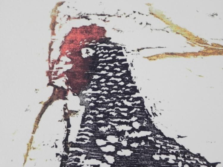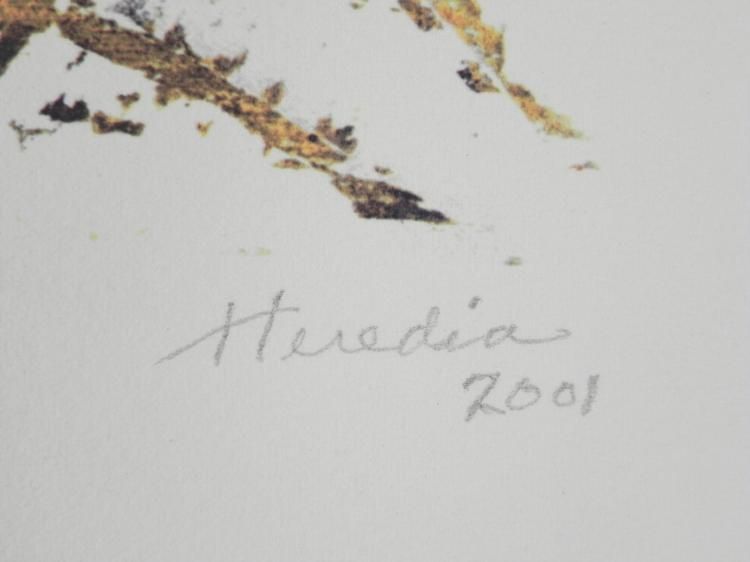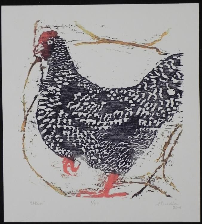This is an original print that portrays a hen scratching at the ground. Artist: Betty HerediaSignature: "Heredia," in pencil, lower rightTitle: HenMedium: Giclee print on heavy paper Sheet size: 12 3/4 x 14 1/2 inches Edition: 1/20Year: 2001 Condition: ExcellentCertificate of Authenticity: Included Midwest Estate Buyers has been entrusted by the estate of Elizabeth (Betty) Heredia (Shapiro) Snyder Rees to offer her personal artwork for public sale. Due to the rapidity that Elizabeth's artwork was sold commercially, this represents a treasure trove of her personal work as submitted by her son. It was her wish and legacy that others should enjoy what she enjoyed. Elizabeth's previous work was sold as rapidly as it became available. We consider this a unique opportunity to take recognition of an enormous talent. Her personal portfolios have now been opened up to reveal a variety of marvelous work, full of color and expression. As in the past, her work has appreciated considerably with time. Betty was a multi-dimensional artist. She was well versed in classic oil painting, water color, wax pencil, charcoal, sumi ink, drawing, hand made paper sculpture, paper mache, clay, wood, marble, printmaking, wood cuts, linoleum block, etching, monotype, serigraph, and multi-media silk screen. Elizabeth attended the Tyler School of Art at Temple University, and studied under the founder, Boris Blai, and printmaker Arthur Flourie. Her work was first shown in California at Stanford University Museum of Art on campus. Many pieces were gifted to museums, including the Palace of the Legion of Honor, San Francisco, CA; Oakland Museum, Oakland, CA; Grand Rapids Museum of Art, Grand Rapids, MI; and according to the estate, the National Museum of American History Art Smithsonian Institution, Washington, DC. She received a deed of gift, certificate number 26800, dated 8/17/2001. Betty's work was known on the San Francisco Peninsula through the San Francisco Women Artists and Bay Area Printmakers Society and was juried into the California State Fair in 1956 and 1957. Betty taught at the Pacific Grove Art Center, and the Monterey Museum of Art, and also had exhibits of her work at these fine institutions. She was featured in a one person show at the Cherry Foundation in Carmel. She was compared to the then greatest living Cubist artist Richard Diebenkorn. Gehan Salinger, art critic of the San Francisco Chronicle for 25 years, referred to Elizabeth as "an unqualified genius." Her art has sold in galleries in Amsterdam and Barcelona to Europeans for their personal collections for many years. She had a solo show in Tokyo, Japan, and another in Denmark. A few of her pieces can be found in public art schools. Also, an oil painting of a marching band is in a special school for the deaf in Daley City, California. Betty passed away at the age of 91. She left behind her wonderful collection of original art. We are glad to bring it to you at what we consider to be very competitive opening bids for such fine artwork.