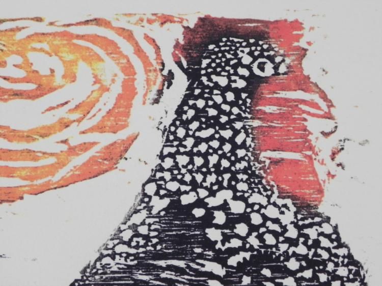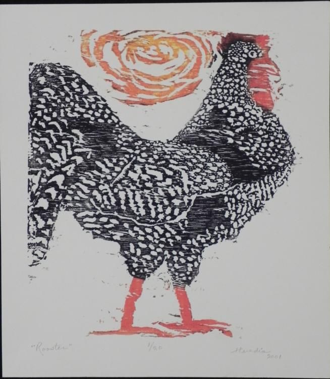 This is an original print that portrays a rooster with the rising sun overhead. * * * Artist: Betty HerediaSignature: "Heredia," in pencil, lower rightTitle: RoosterMedium: Giclee print on heavy paper Sheet size: 12 3/4 x 14 1/2 inches Edition: 1/20Year: 2001 * * Condition: ExcellentCertificate of Authenticity: Included * Midwest Estate Buyers has been entrusted by the estate of Elizabeth (Betty) Heredia (Shapiro) Snyder Rees to offer her personal artwork for public sale. Due to the rapidity that Elizabeth's artwork was sold commercially, this represents a treasure trove * of her personal work as submitted by her son. It was her wish and legacy that others should enjoy what she enjoyed. * * * * * Elizabeth's previous work was sold as rapidly as it became available. We consider this a unique opportunity to take recognition of an enormous talent. Her personal portfolios have now been opened up to reveal a variety of marvelous work, full of color * and expression. * * As in the past, her work has appreciated considerably with time. * * Betty was a multi-dimensional artist. She was well versed in classic oil painting, water color, wax pencil, charcoal, sumi ink, drawing, hand made paper sculpture, paper mache, clay, wood, marble, printmaking, wood cuts, linoleum block, etching, monotype, serigraph, * and multi-media silk screen. * Elizabeth attended the Tyler School of Art at Temple University, and studied under the founder, Boris Blai, and printmaker Arthur Flourie. * * * * * Her work was first shown in California at Stanford University Museum of Art on campus. Many pieces were gifted to museums, including the Palace of the Legion of Honor, San Francisco, CA; Oakland Museum, Oakland, CA; Grand Rapids Museum of Art, Grand Rapids, * MI; and according to the estate, the National Museum of American History Art Smithsonian Institution, Washington, DC. She received a deed of gift, certificate number 26800, dated 8/17/2001. * * Betty's work was known on the San Francisco Peninsula through the San Francisco Women Artists and Bay Area Printmakers Society and was juried into the California State Fair in 1956 and 1957. Betty taught at the Pacific Grove Art Center, and the Monterey * Museum of Art, and also had exhibits of her work at these fine institutions. She was featured in a one person show at the Cherry Foundation in Carmel. * * She was compared to the then greatest living Cubist artist Richard Diebenkorn. Gehan Salinger, art critic of the San Francisco Chronicle for 25 years, referred to Elizabeth as "an unqualified genius." * * * Her art has sold in galleries in Amsterdam and Barcelona to Europeans for their personal collections for many years. She had a solo show in Tokyo, Japan, and another in Denmark. * * * A few of her pieces can be found in public art schools. Also, an oil painting of a marching band is in a special school for the deaf in Daley City, California. * * Betty passed away at the age of 91. * * She left behind her wonderful collection of original art. We are glad to bring it to you at what we consider to be very competitive opening bids for such fine artwork. * * *