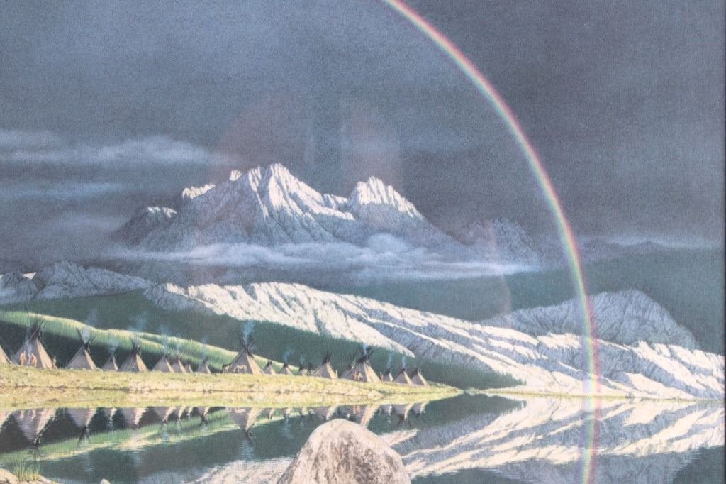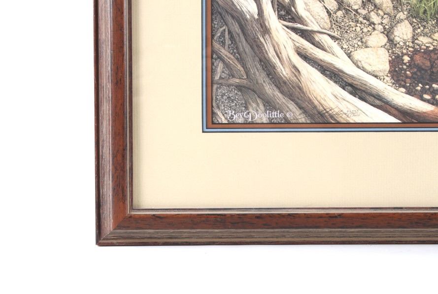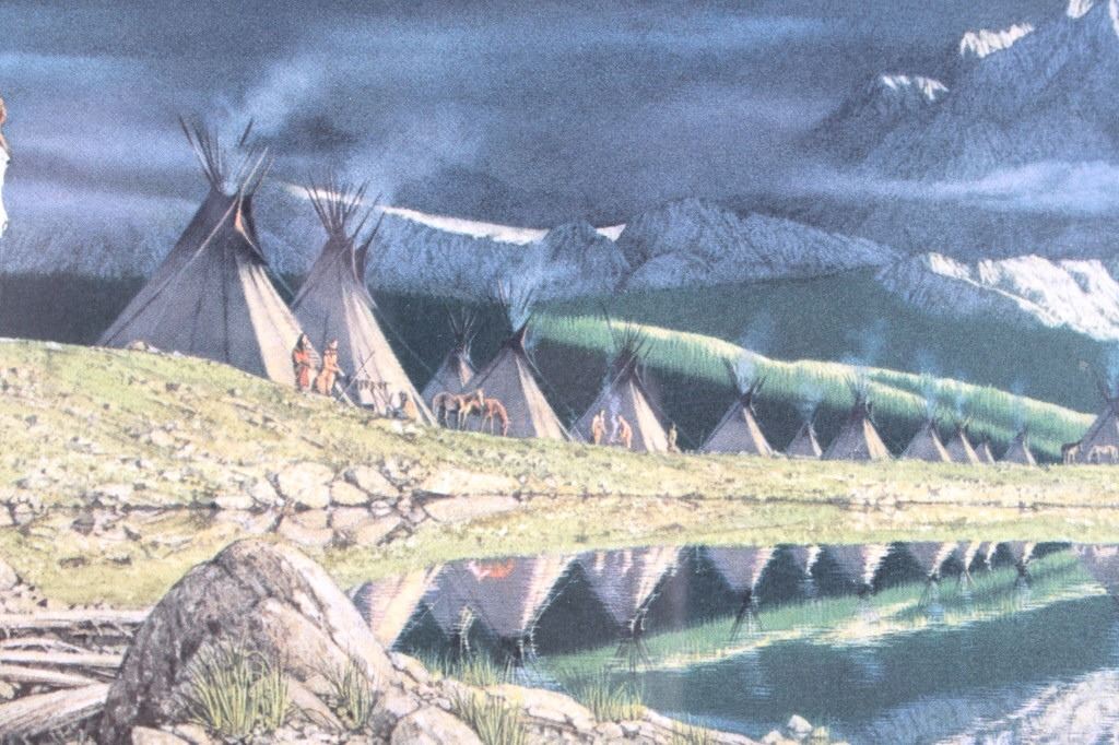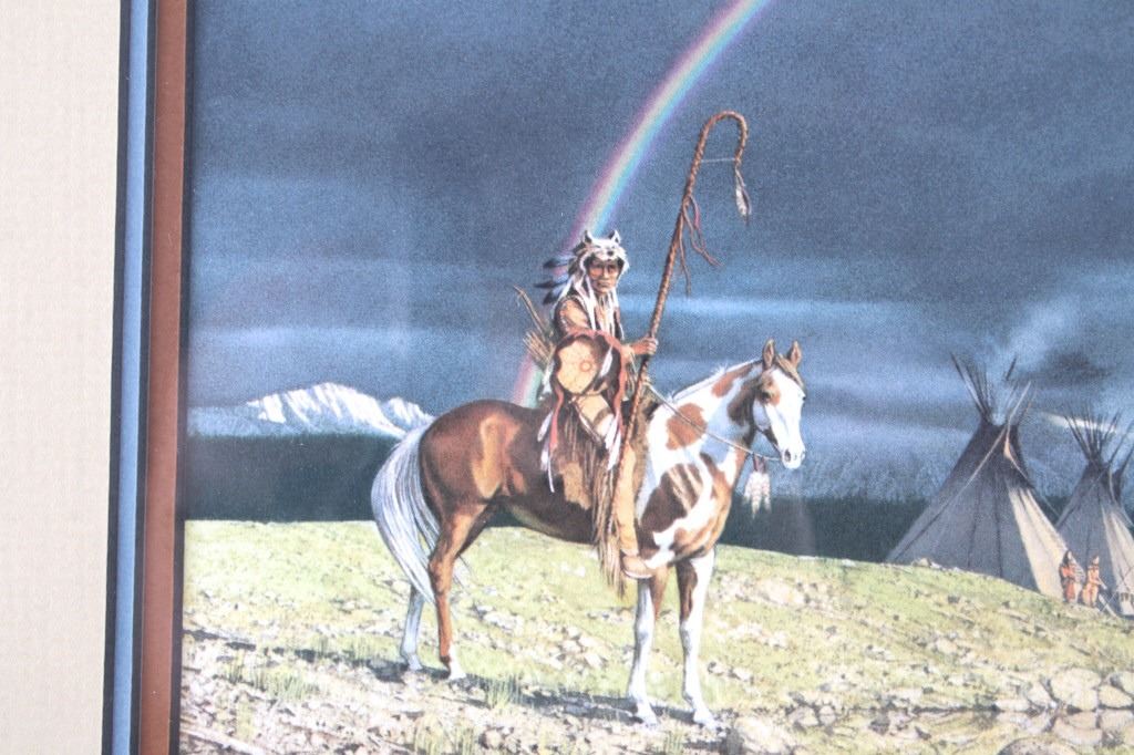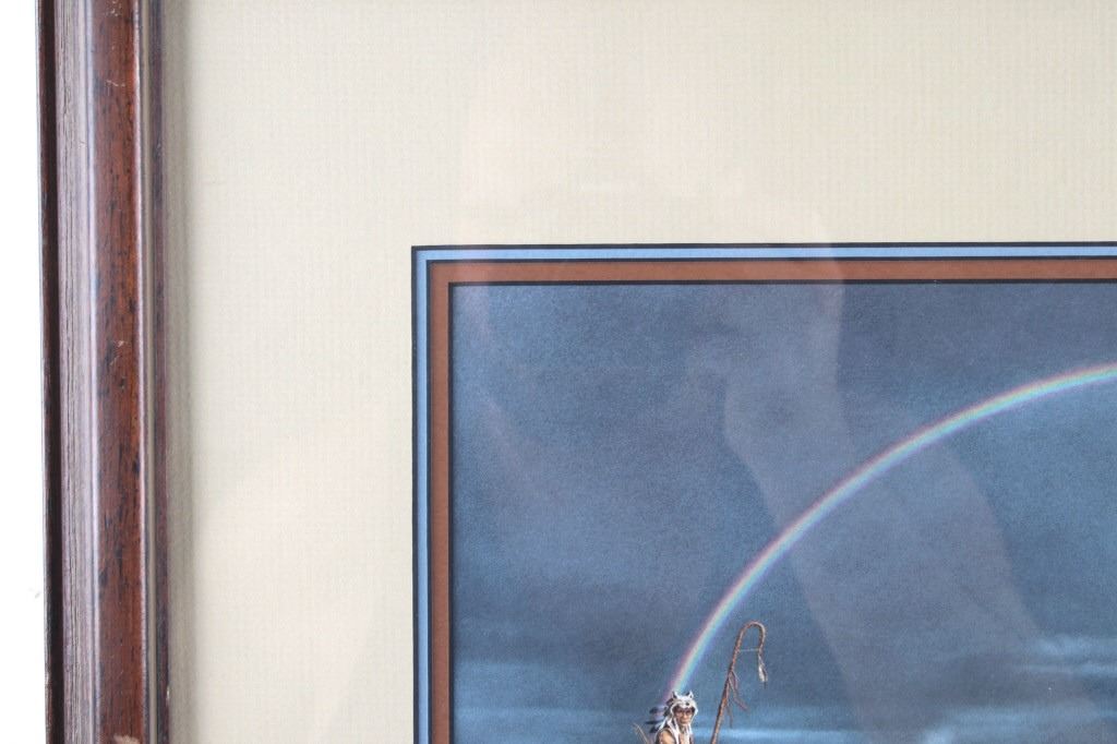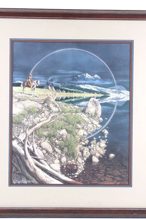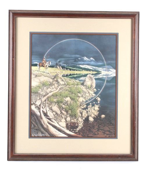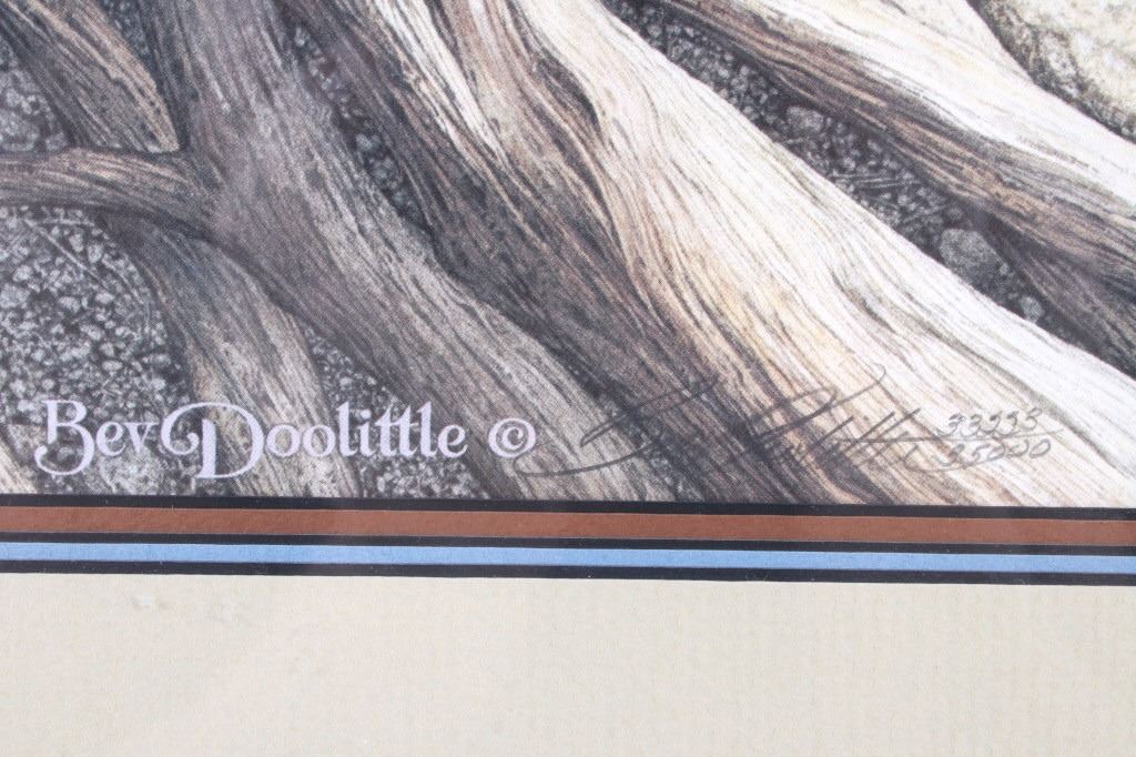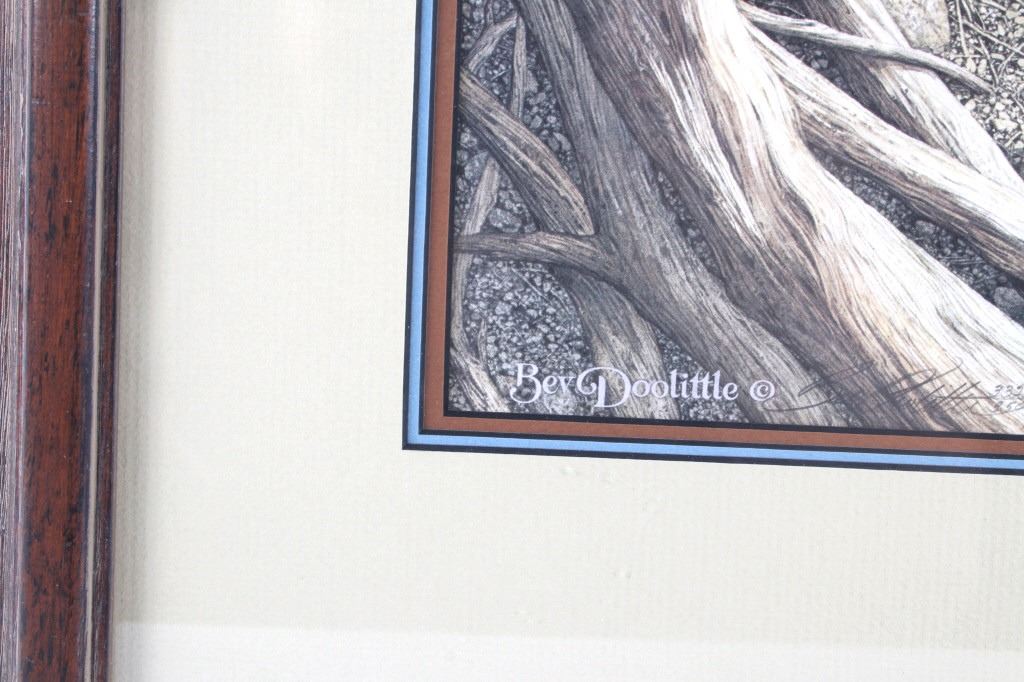 Featured in this lot is this framed artwork called "The Sentinel" by artist Bev Doolittle born in 1947. The print features a wonderfully and professionally crafted print that shows a native man on horse back outside of a village on the lakeside with a rainbow in the sky. The print is signed in the bottom left hand corner and is numbered 33223/35000. Bev Doolittle is one of the most collected artists in America. Known for her “camouflage artwork”, in which the background composition comes together to form a hidden image, most of her art has a western motif and focuses on the link between man and nature. Doolittle attended art school in Los Angeles where she met her husband. Working for several years as an art director for an advertising agency in LA, she began to crave the outdoors and wanted to get away from the city to get more in tune with nature. The book "New Magic" begins where the first book left off-at the start of an exciting period in the artists life. After "The Art of Bev Doolittle" was published, Bev had what she called “a kind of vision.” She found herself traveling new paths, exploring new ideas, and finding adventure in both the public arena and the wilderness. Concerned about endangered species and wildlife habitats, Doolittle saw her mission and started to paint it, In her most recent works of art she creates the wild, gorgeous world of nature and through her magic, draws in all of us to celebrate the wonder of life. The condition of this framed print is good with no obvious signs of damage and shows good overall condition. The measurements of this framed print is 26 1/4" x 23" and the visible artwork measures 17 5/8" x 14 5/8".