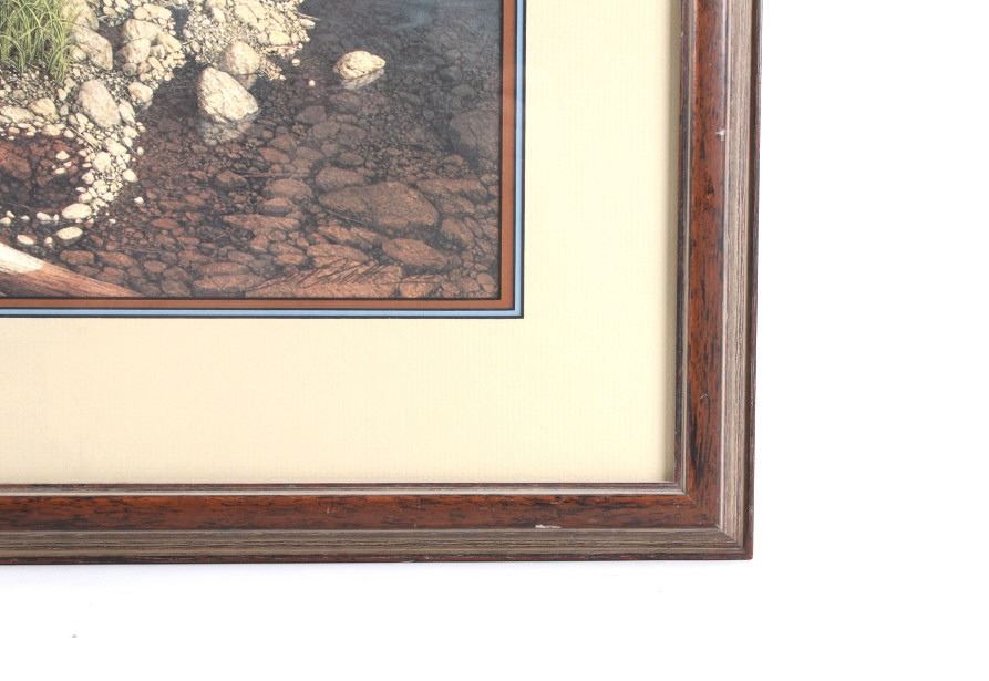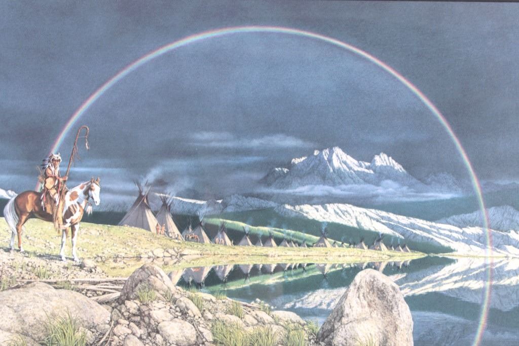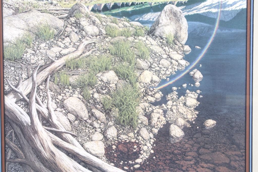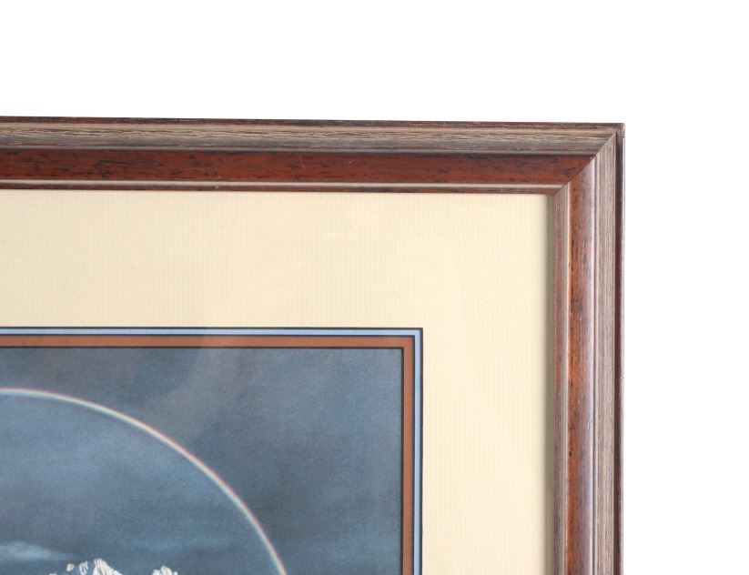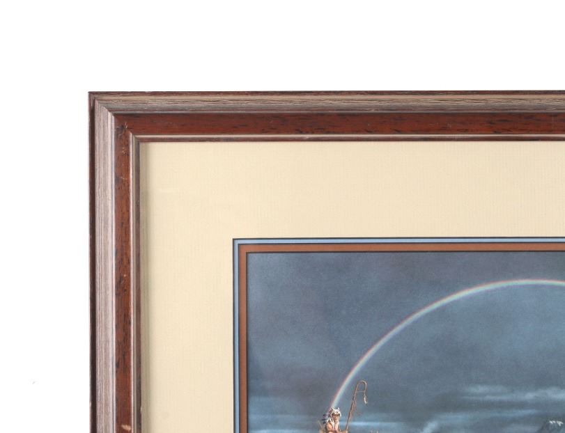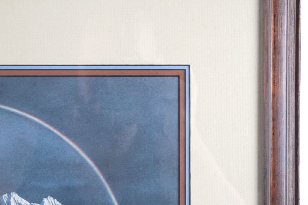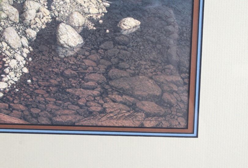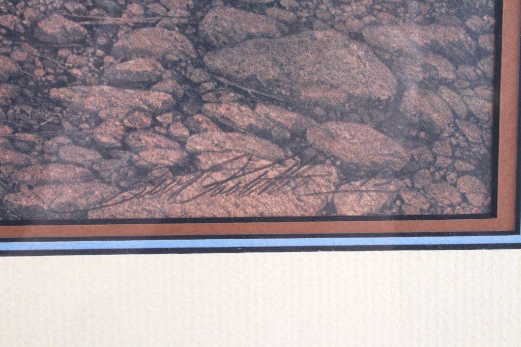 Featured in this lot is this framed artwork called "The Sentinel" by artist Bev Doolittle born in 1947. The print features a wonderfully and professionally crafted print that shows a native man on horse back outside of a village on the lakeside with a rainbow in the sky. The print is signed in the bottom left hand corner and is numbered 33223/35000. Bev Doolittle is one of the most collected artists in America. Known for her “camouflage artwork”, in which the background composition comes together to form a hidden image, most of her art has a western motif and focuses on the link between man and nature. Doolittle attended art school in Los Angeles where she met her husband. Working for several years as an art director for an advertising agency in LA, she began to crave the outdoors and wanted to get away from the city to get more in tune with nature. The book "New Magic" begins where the first book left off-at the start of an exciting period in the artists life. After "The Art of Bev Doolittle" was published, Bev had what she called “a kind of vision.” She found herself traveling new paths, exploring new ideas, and finding adventure in both the public arena and the wilderness. Concerned about endangered species and wildlife habitats, Doolittle saw her mission and started to paint it, In her most recent works of art she creates the wild, gorgeous world of nature and through her magic, draws in all of us to celebrate the wonder of life. The condition of this framed print is good with no obvious signs of damage and shows good overall condition. The measurements of this framed print is 26 1/4" x 23" and the visible artwork measures 17 5/8" x 14 5/8".