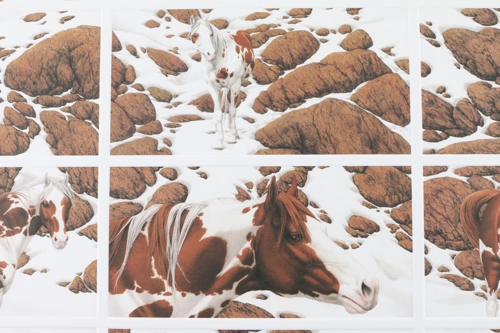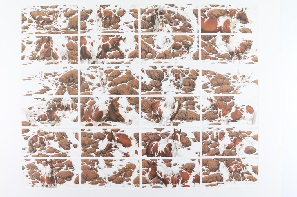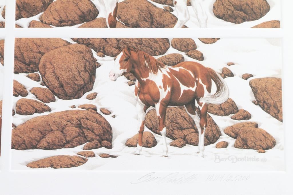 Hide and Seek Suite is a composite print on a thick paper. It is hand-signed and numbered 15619/25000 in the lower right hand of print and 15619 on the outside of the envelope. "A description of the work is much like the adage about describing a horse...it varies widely depending on which part of the animal one sees." It is created from 23 images of little paintings against a snow and rock background. The 24th image has no painted pinto pony. Only when all 24 images come together can you see them spell out "Hide and Seek". It is embossed with the Greenwich Workshop logo, which creates her prints, located in Trumbull, CT. Bev Doolittle was born and raised in California. In 1968, graduated from the Art Center College of Design in Los Angeles. She wanted to be close to nature and traveled. Her paintings depict our Western wilderness and its inhabitants, with detailed realism. Measures 32"L x 26" Tall. Year Print: 1990. Size of Edition: 25,000. NEW in Original Packaging. Documentation certificate enclosed. Excellent Condition.