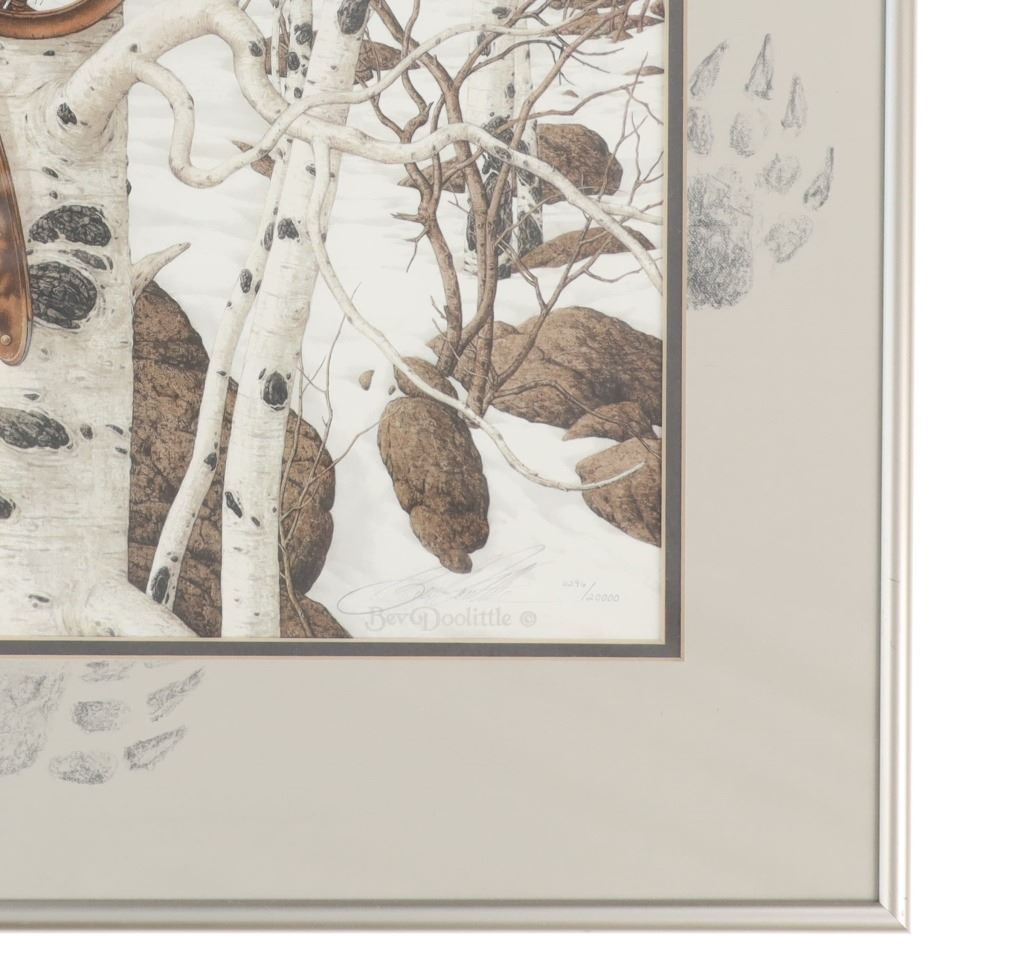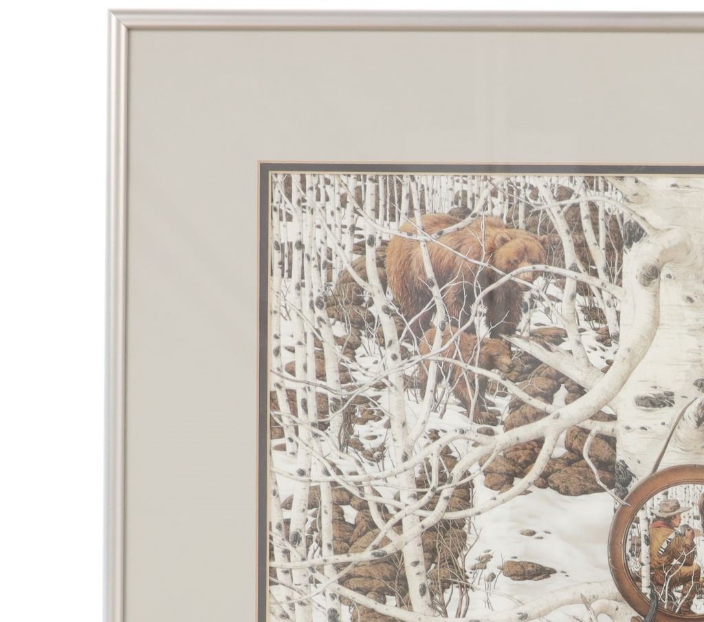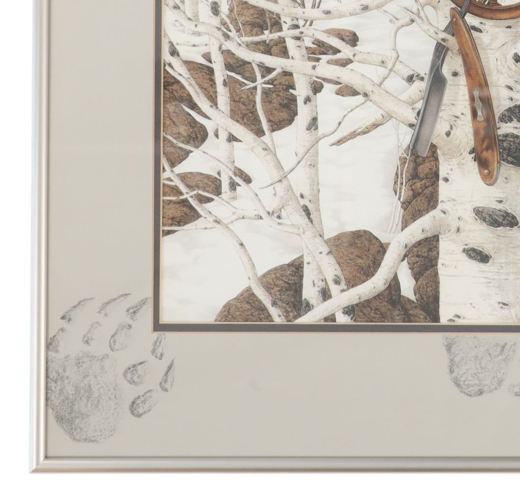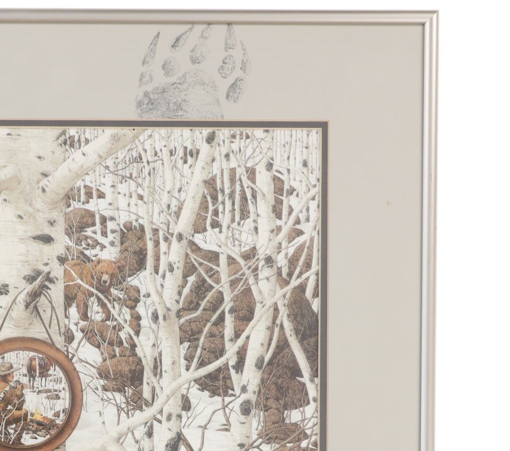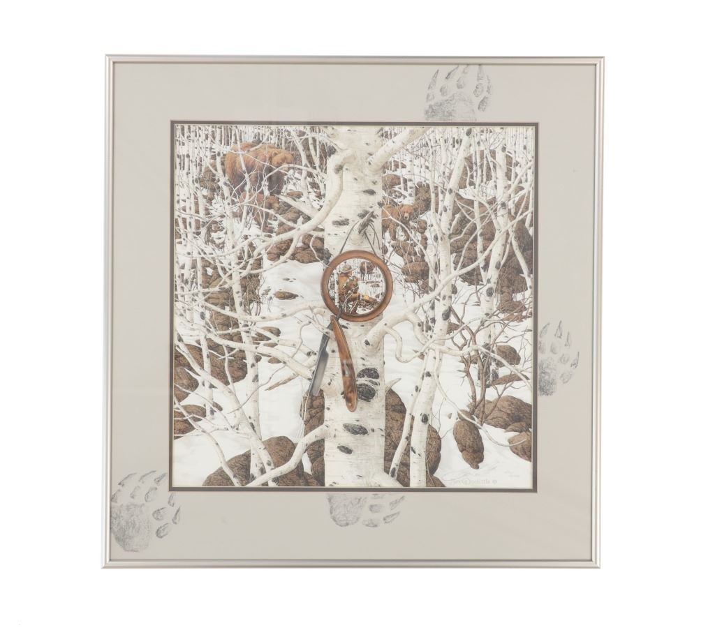 For your consideration is this limited edition Bev Doolittle print titled, "Three More For Breakfast" circa 1996. Bev Doolittle is one of the most collected artists in America. Known for her “camouflage artwork”, in which the background composition comes together to form a hidden image, most of her art has a western motif and focuses on the link between man and nature. Doolittle attended art school in Los Angeles where she met her husband. Working for several years as an art director for an advertising agency in LA, she began to crave the outdoors and wanted to get away from the city to get more in tune with nature. She found herself traveling new paths, exploring new ideas, and finding adventure in both the public arena and the wilderness. Concerned about endangered species and wildlife habitats, Doolittle saw her mission and started to paint it. In her most recent works of art she creates the wild, gorgeous world of nature and through her magic, draws in all of us to celebrate the wonder of life. This print shows a reflection of a man through a mirror cooking some breakfast as three bears walk behind him, curious of what he is doing. The man is unaware of the bears as he sips his coffee from his tin mug. Excerpt from Bev Doolittle - "Reflected in the mirror, a mountain man is enjoying a quiet morning...It's not a good idea, however to cook bacon in bear country...unless you're great at tree-climbing!" - Bev Doolittle. The print is signed by the artist in the bottom right hand corner reading, "Bev Doolittle ©" and shows the limited edition print number next to it reading, "4296/20000" in pencil. The print is set in a silver colored frame and is matted twice with dark grey and light grey matting paper. The light grey matting paper features four bear paw prints drawn onto it. The visible art measures 14 3/4" L x 14 11/16" W, while the entire piece measures 21 1/8" L x 20 1/2" W x 7/8" D. It weighs 5 pounds and 4 ounces.