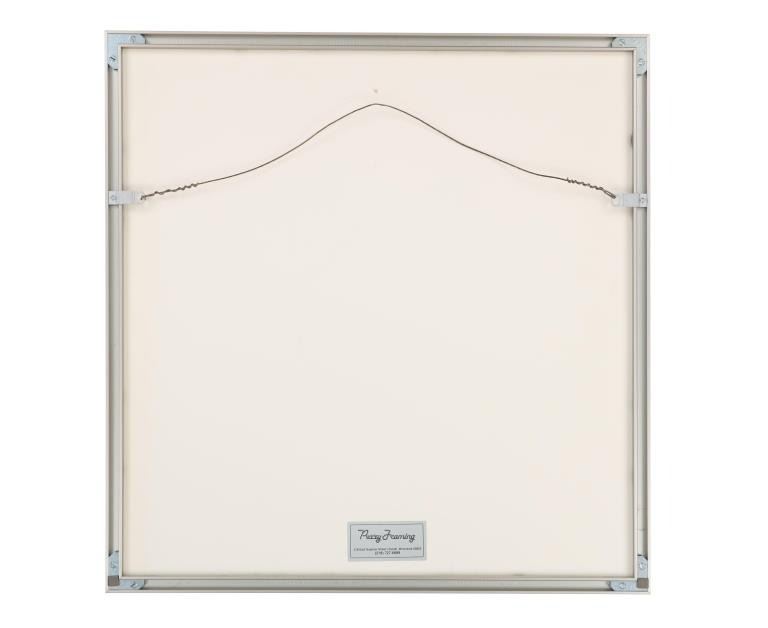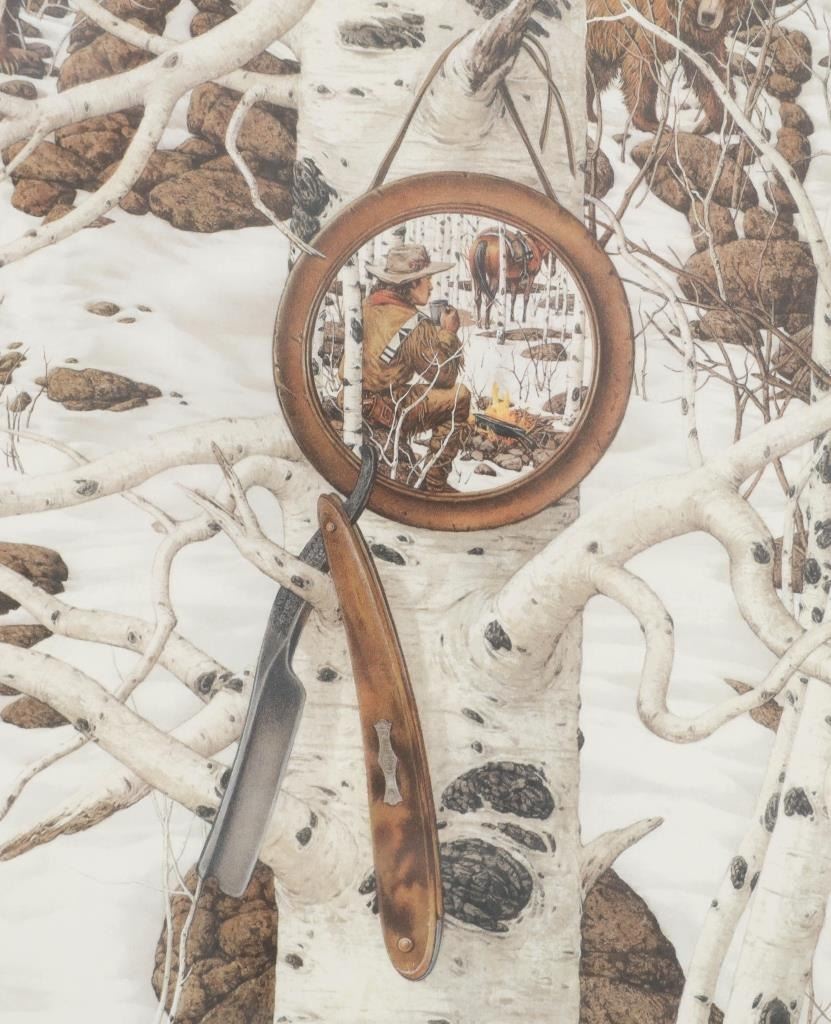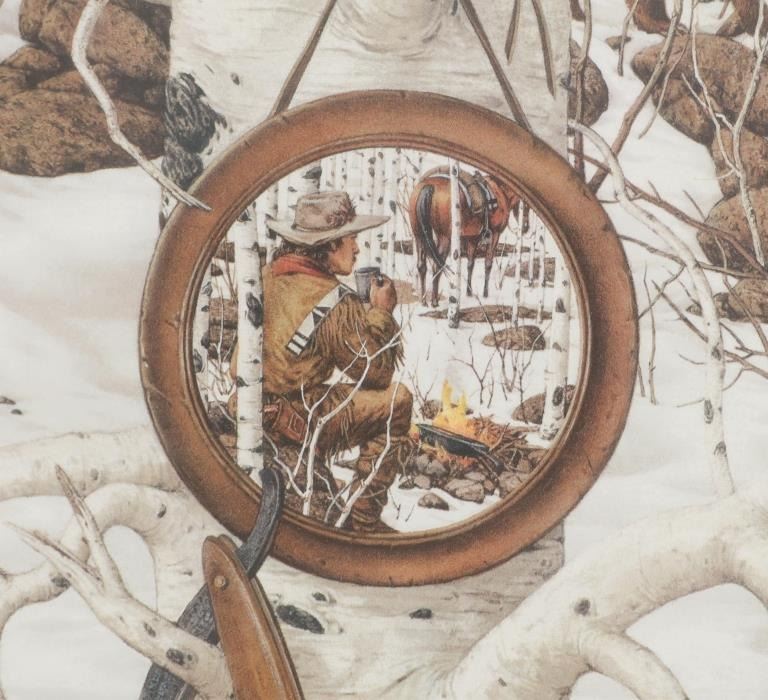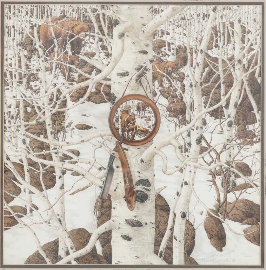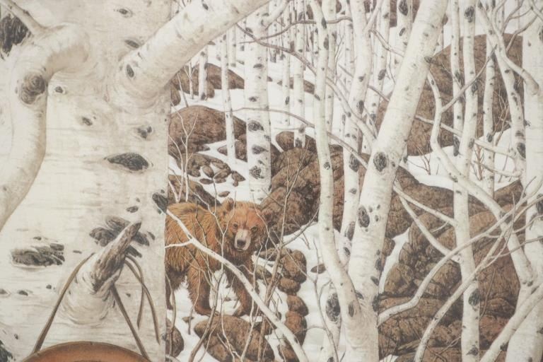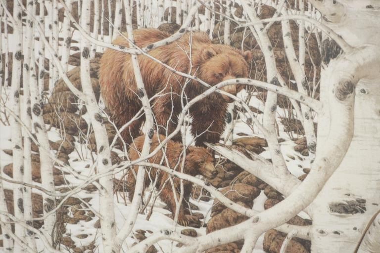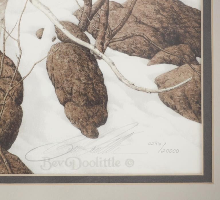 For your consideration is this limited edition Bev Doolittle print titled, "Three More For Breakfast" circa 1996. Bev Doolittle is one of the most collected artists in America. Known for her “camouflage artwork”, in which the background composition comes together to form a hidden image, most of her art has a western motif and focuses on the link between man and nature. Doolittle attended art school in Los Angeles where she met her husband. Working for several years as an art director for an advertising agency in LA, she began to crave the outdoors and wanted to get away from the city to get more in tune with nature. She found herself traveling new paths, exploring new ideas, and finding adventure in both the public arena and the wilderness. Concerned about endangered species and wildlife habitats, Doolittle saw her mission and started to paint it. In her most recent works of art she creates the wild, gorgeous world of nature and through her magic, draws in all of us to celebrate the wonder of life. This print shows a reflection of a man through a mirror cooking some breakfast as three bears walk behind him, curious of what he is doing. The man is unaware of the bears as he sips his coffee from his tin mug. Excerpt from Bev Doolittle - "Reflected in the mirror, a mountain man is enjoying a quiet morning...It's not a good idea, however to cook bacon in bear country...unless you're great at tree-climbing!" - Bev Doolittle. The print is signed by the artist in the bottom right hand corner reading, "Bev Doolittle ©" and shows the limited edition print number next to it reading, "4296/20000" in pencil. The print is set in a silver colored frame and is matted twice with dark grey and light grey matting paper. The light grey matting paper features four bear paw prints drawn onto it. The visible art measures 14 3/4" L x 14 11/16" W, while the entire piece measures 21 1/8" L x 20 1/2" W x 7/8" D. It weighs 5 pounds and 4 ounces.